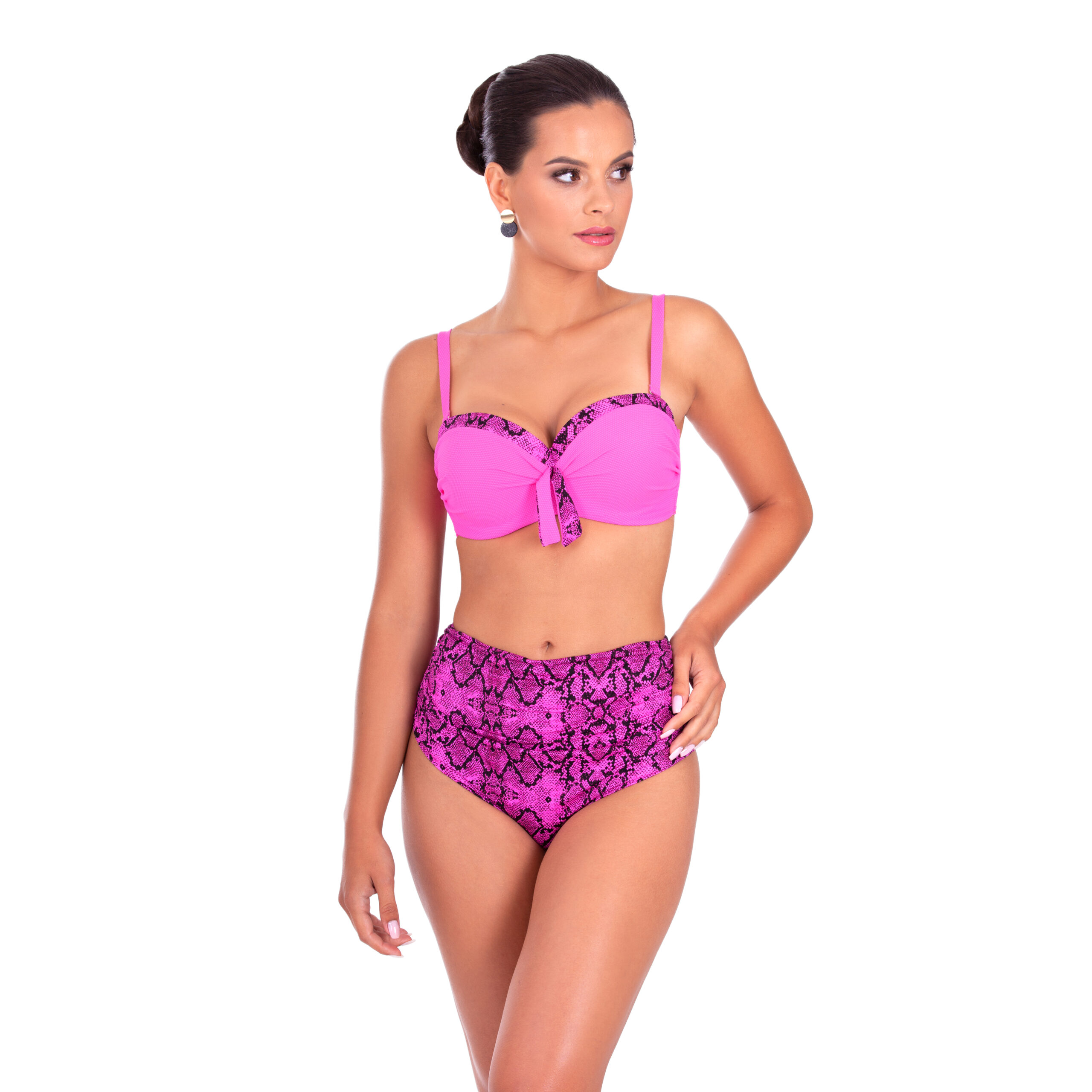 Dwuczęściowy strój Abi / B3 to połączenie modnego bikini z efektownym miseczkowym stanikiem typu push-up. Miseczki są wyposażone w wyjmowane wkładki, które pozwalają na dowolne modelowanie biustu. Fiszbiny umieszczone w miękkiej kieszonce zapewniają dodatkowe wsparcie dla piersi, podtrzymując je i modelując kształt. Majtki w wysokim kroju kusząco eksponują biodra i podkreślają talię, a ich zwierzęcy wzór dodaje całości drapieżnego charakteru.