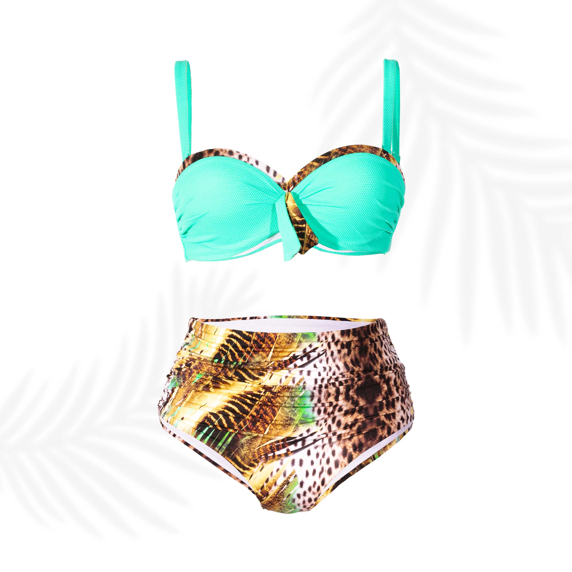 Miętowy kostium kąpielowy Abi / F11 z wysokim stanem to prawdziwe cudo. Jego górna część przypomina stylowy top z delikatnym motywem zwierzęcym. Fiszbiny i wyjmowane wkładki push-up podkreślają biust, a delikatne falbanki dodają uroku. Dolna część to majtki o wysokim stanie, które doskonale modelują sylwetkę i zakrywają pośladki. Kostium łączy w sobie dwie odrębne części, które razem tworzą zjawiskowy efekt. Miseczki biustonosza oraz fiszbiny umieszczone w miękkiej kieszonce gwarantują wygodę nawet najbardziej wrażliwym obszarom ciała.