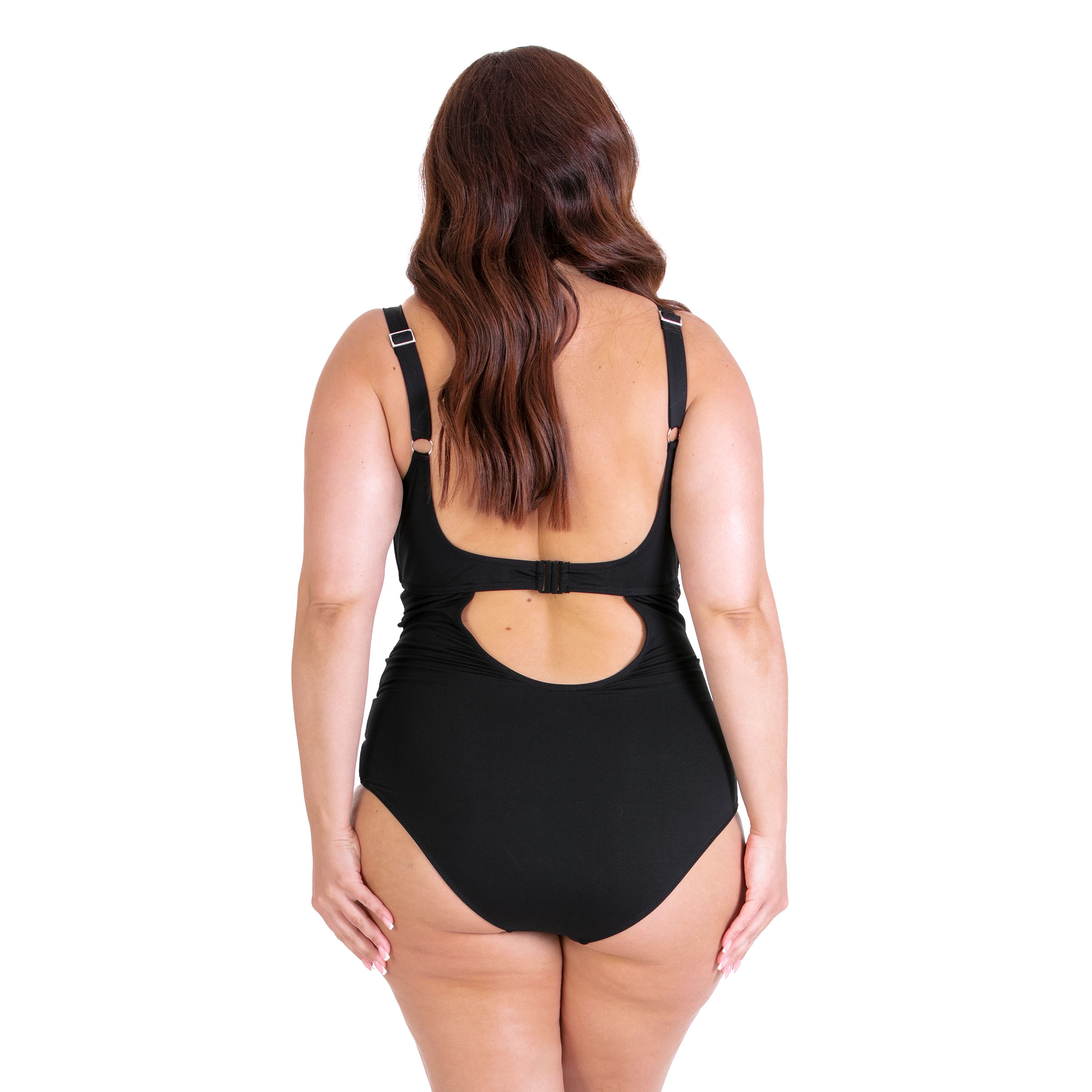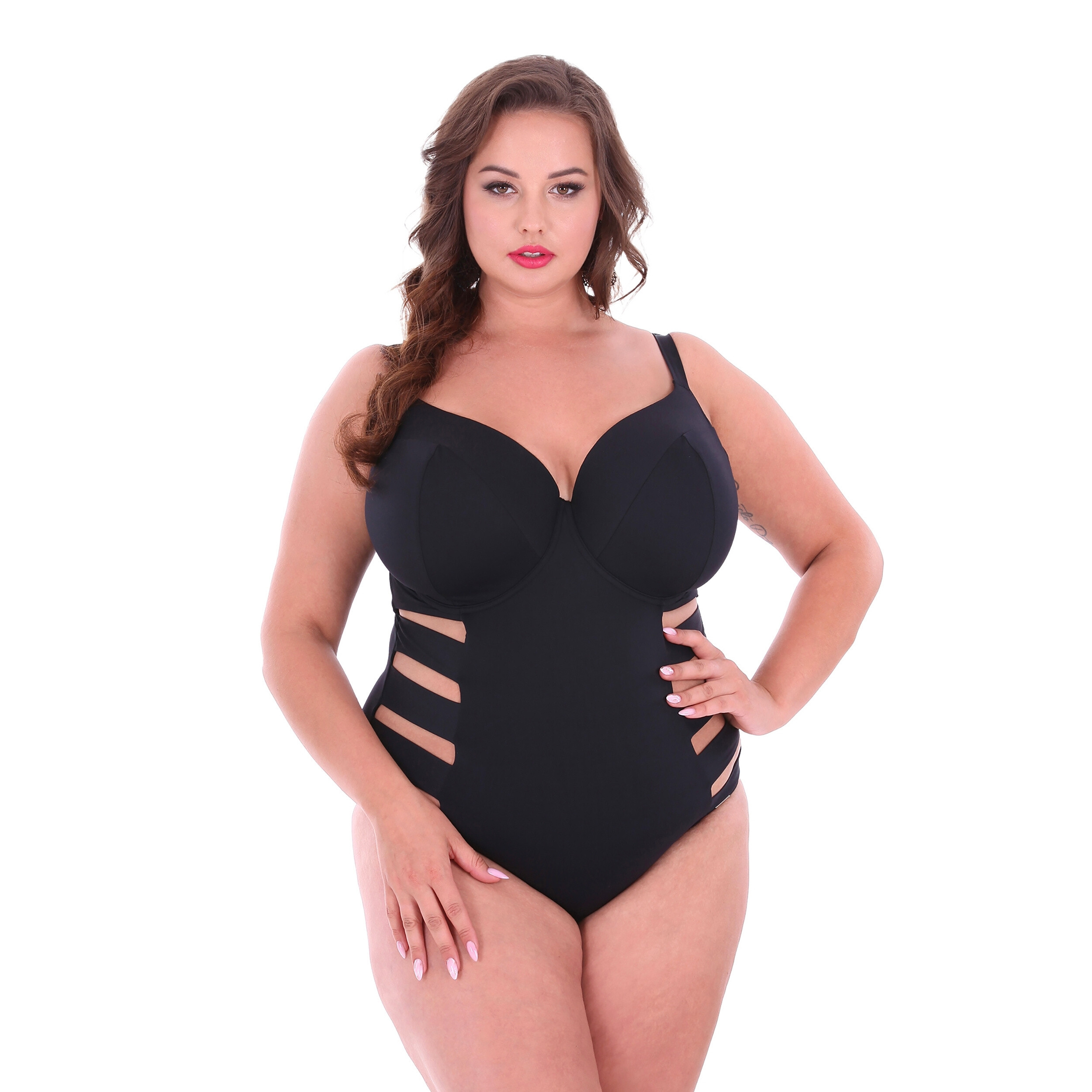 Unikatowy fason z rozcięciami po bokach czeka na Ciebie, abyś ujawniła skrywane pokłady seksapilu. Aleksja P to model dla kobiet kochających połączenie klasyki z nowoczesnością. Czarny strój kąpielowy Aleksja P stanowi kombinację stroju jednoczęściowego oraz bikini. To tzw. monokini, które zasłania sporą powierzchnię ciała, ale również wiele odsłania. Sprytny fason zakrywa strefę brzucha, a zmysłowe rozcięcia po bokach podkreślają talię oraz biodra. Perfekcyjnie uformowany biustonosz nadaje atrakcyjny kształt dużemu biustowi. Dekolt w kształcie serca, z wyraźnym dołeczkiem, wzbudza ciekawość otoczenia. Piankowe miseczki zgrabnie otulają piersi, zapewniając pożądany komfort. Świadomość wrażliwości kobiecego ciała skłoniła nas także do stworzenia specjalnej konstrukcji fiszbin schowanych w solidnej miękkiej kieszonce, abyś z każdej aktywności czerpała pełnię przyjemności. Praktyczne podwójne zapięcie na zatrzask oraz szerokie, regulowane ramiączka zapewniają skuteczne podtrzymanie nawet bardzo dużego biustu i wygodę w każdej sytuacji. Apetyczną opaleniznę uzyskasz, odpinając ramiączka. Wysoka linia fig i lekko odsłonięte plecy dopełniają intrygujący fason.