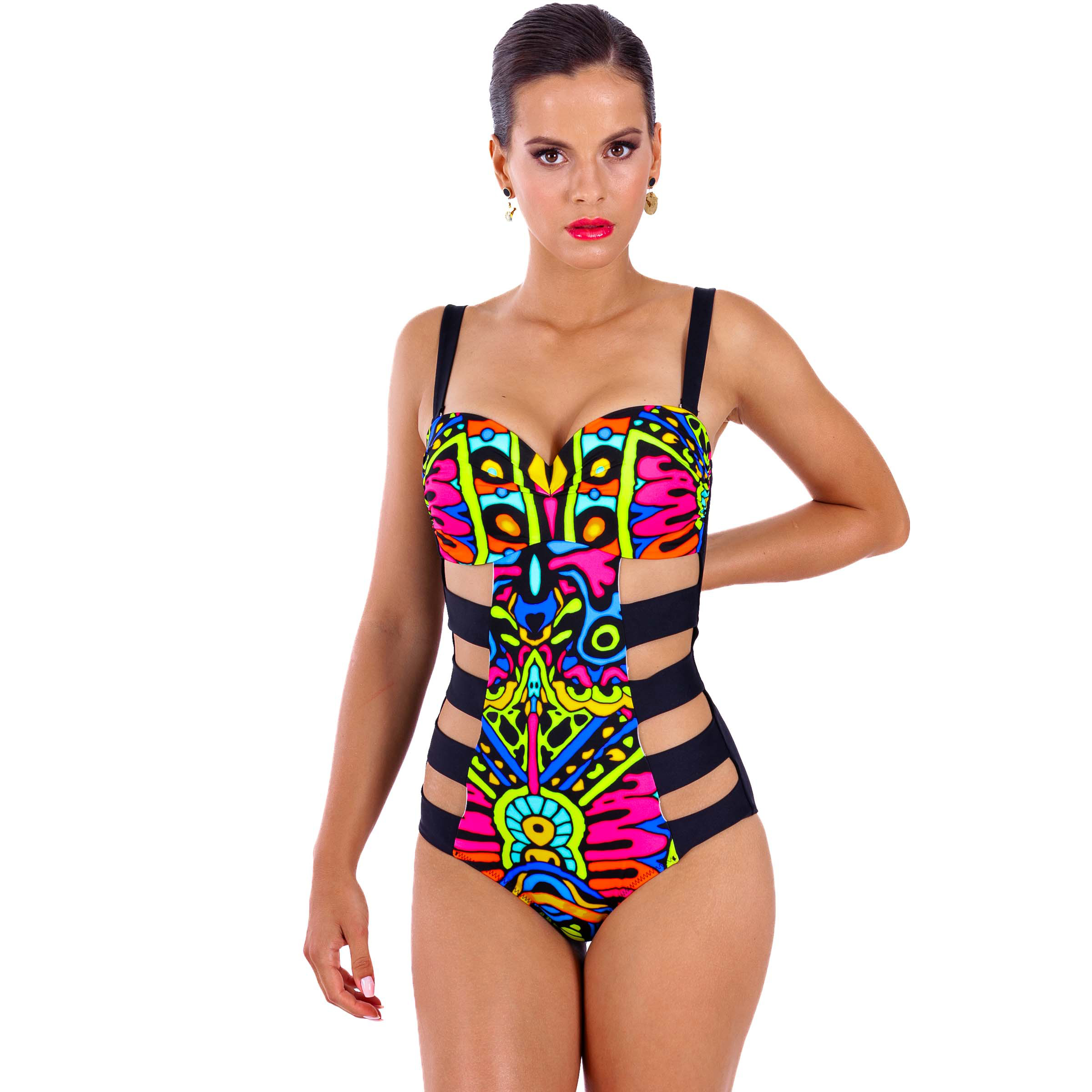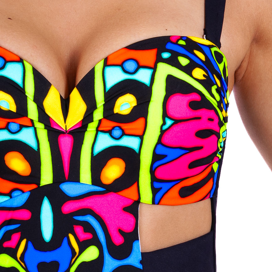 Przykuwający wzrok strój kąpielowy Aleksja posiada unikalny, wielobarwny wzór, który ożywi każdą stylizację plażową. Gładka, miękka tkanina nie odkształca się, a jej intensywne barwy pozostają nienaruszone, nawet pod wpływem słonej lub chlorowanej wody oraz promieni słonecznych. Wysokogatunkowe materiały zapewniają komfort noszenia i nieprześwitującą ochronę, co jest niezwykle istotne podczas letniego wypoczynku.
