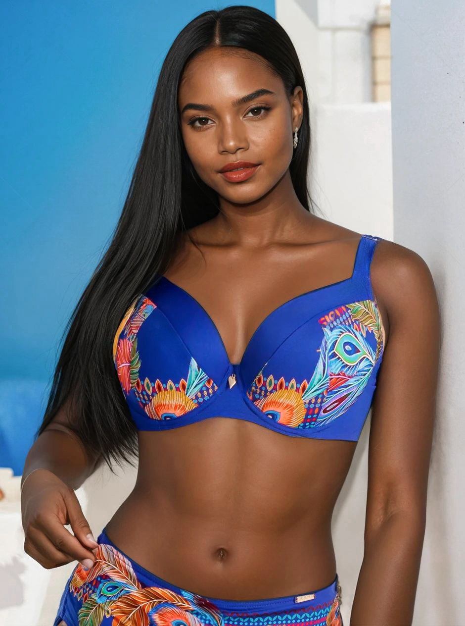 Odkryj kwintesencję letniego stylu w królewskim odcieniu kobaltowego błękitu. Ten wyjątkowy biustonosz kąpielowy to perfekcyjne połączenie funkcjonalności i egzotycznego designu, gdzie pawie pióra tańczą w towarzystwie intensywnych kolorów, tworząc prawdziwą plażową symfonię.
