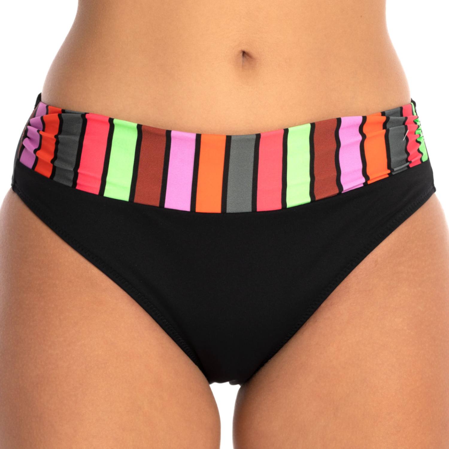 Czarny kolor i kolorowe pasy w jednym to połączenie, które przyciąga wzrok i zaskakuje. Majtki kąpielowe Brigitt C vC, to propozycja dla kobiet ceniących klasyczne rozwiązania z nutą oryginalności. Ten model to połączenie stylu i komfortu, które pozwolą Ci cieszyć się każdą chwilą spędzoną na plaży.