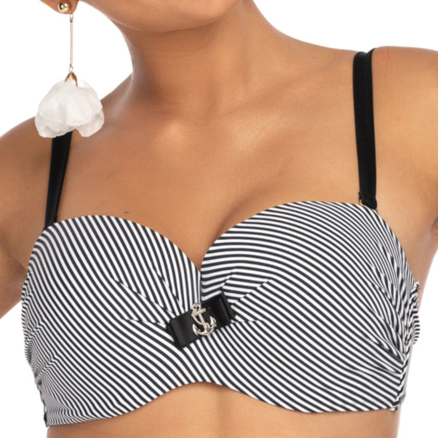 W dwuczęściowym stroju kąpielowy Brigitt H kobiety o obfitszych kształtach poczują się wyjątkowo. Delikatny wzór biało-czarnych pasów na biustonoszu przykuwa uwagę do górnej części ciała. Usztywniane miseczki trzymają w ryzach duży biust. Fiszbiny nadają im atrakcyjny kształt. Wyjmowane wkładki push-up sprzyjają również wyeksponowaniu nieco mniejszych piersi. Fantazyjne majtki z wysokim stanem zakrywają brzuch i niwelują widoczność fałdek po bokach. Prześwitujące wstawki materiału z przodu dodają projektowi odrobinę pikanterii. Pośladki pozostają zakryte.