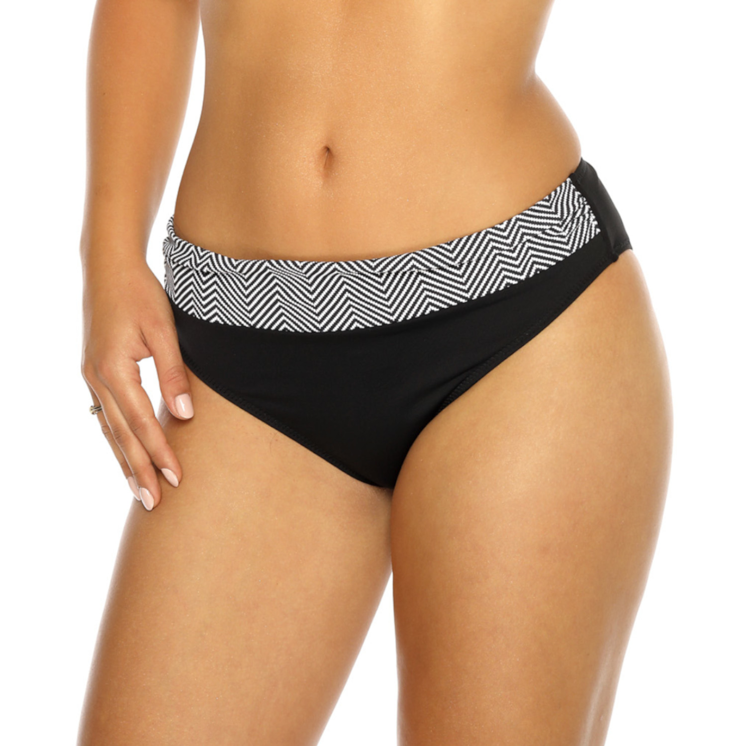 Brigitt Z dodaje uroku kobietom o krągłych kształtach. Dzięki usztywnianym miseczkom i fiszbinom biust prezentuje się atrakcyjnie. Wkładki push-up są wyjmowane, dzięki czemu biustonosz można dopasować do indywidualnych wymagań. Drobny biało-czarny wzór koncentruje uwagę na górnej części ciała, a jego wstawka na figach efektownie uzupełnia kostium. Klasyczne majtki przysłaniają brzuch i wyszczuplają biodra oraz całą sylwetkę.