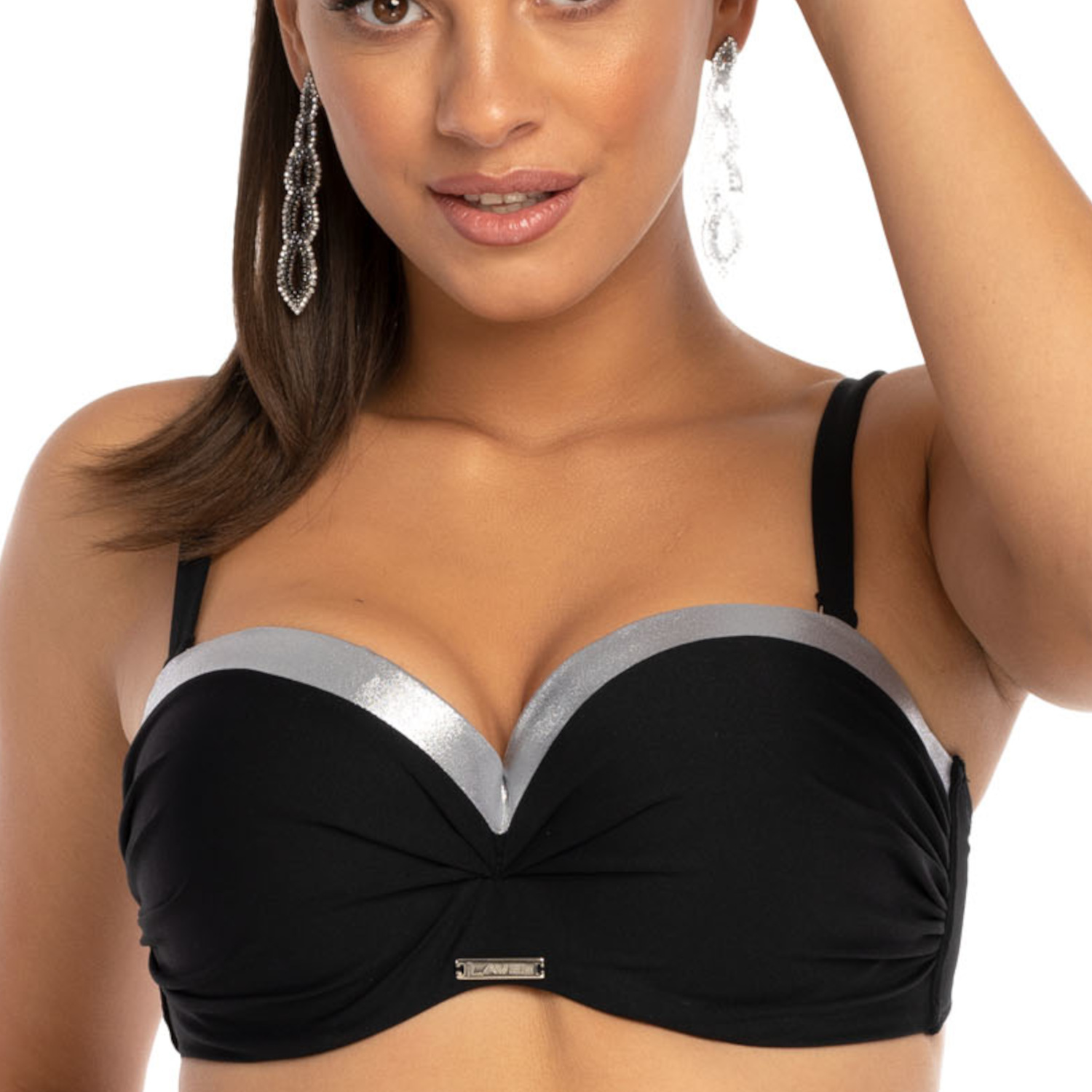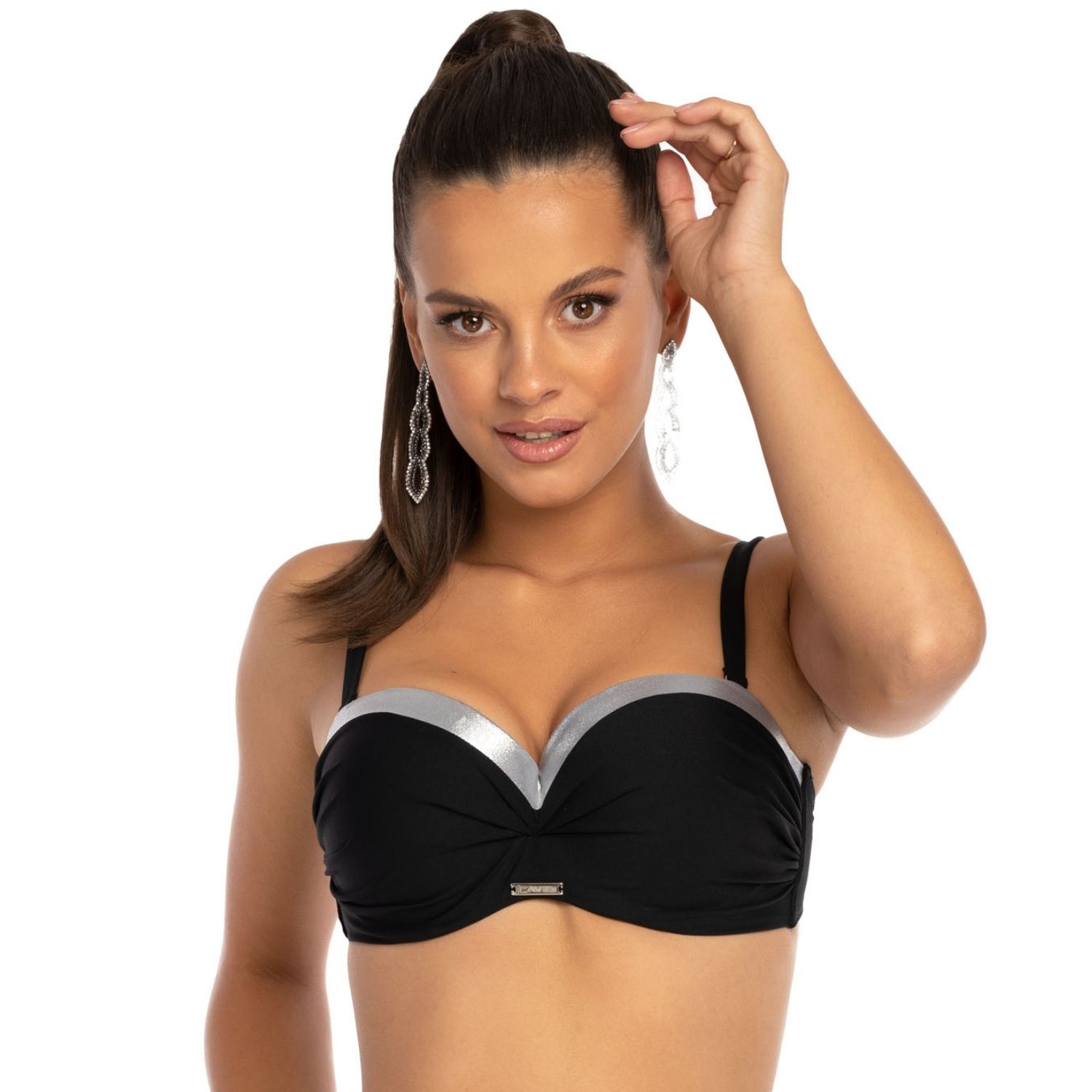 Gładki materiał jest cienki i miękko przylega do ciała. Prezentowany model bardotki to autorska konstrukcja Lavel, która wymownie akcentuje krągłości małych oraz dużych biustów. Zapewnia doskonałe podtrzymanie dzięki regulowanym ramiączkom oraz fiszbinom. Wkładki push-up apetycznie powiększają piersi, ale łatwo dostosować biustonosz do swoich potrzeb dzięki temu, że są wyjmowane. Miękkie kieszonki otulają fiszbiny, co zapewnia komfort podczas pływania i innych aktywności fizycznych. Ramiączka można zapiąć również na krzyż i odpiąć dla uzyskania idealnie opalonego dekoltu. Zapięcie z tyłu ma wygodny zatrzask. Marszczenie między piersiami dodaje kokieterii, a wykończenie srebrną lamówką luksusowego wyglądu.