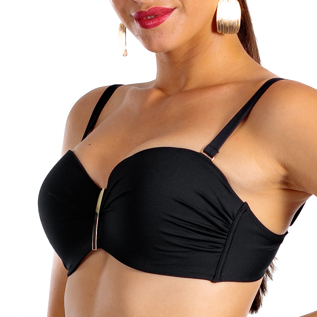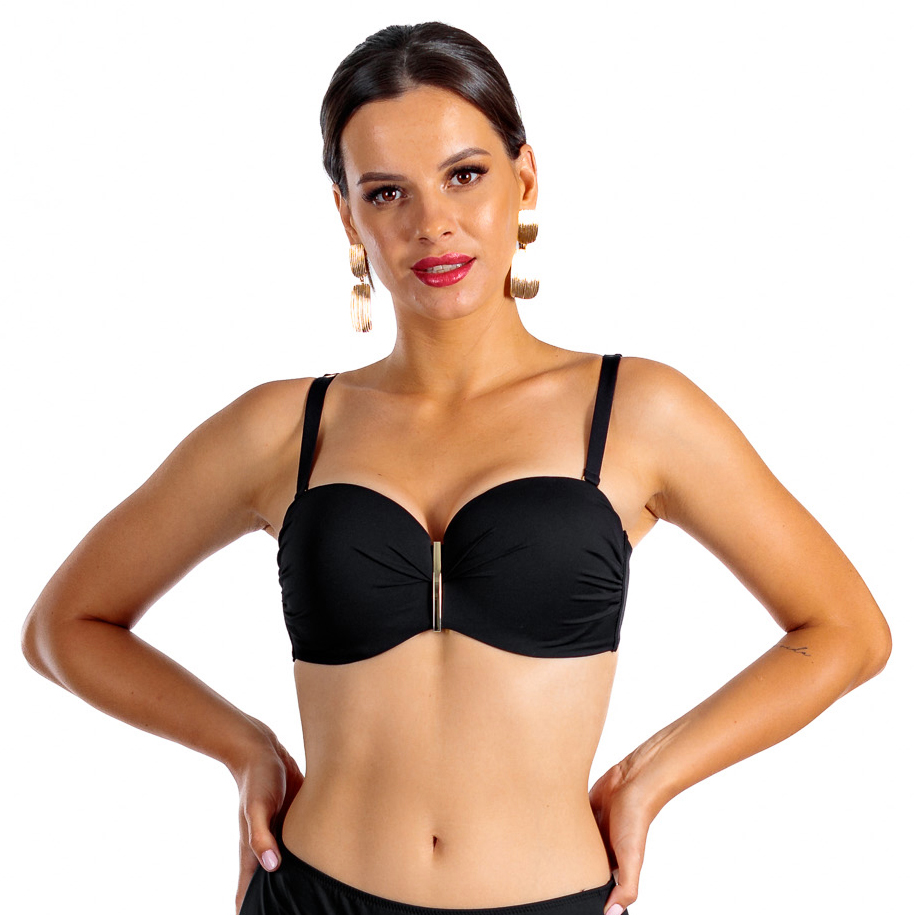 Klasyczna czerń i elegancki fason bardotki to duet, który nigdy nie wychodzi z mody. Złote akcenty dodają całości ekskluzywnego charakteru, czyniąc ten model idealnym wyborem zarówno na plażę, jak i przy basenie. Dobierz osobono rozmiar obwodu i miseczki i czuj się jak w swojej ulubionej bieliźnie.