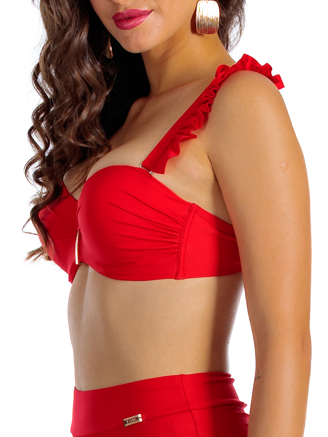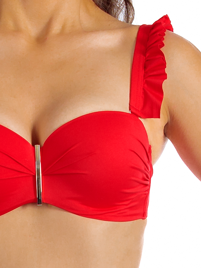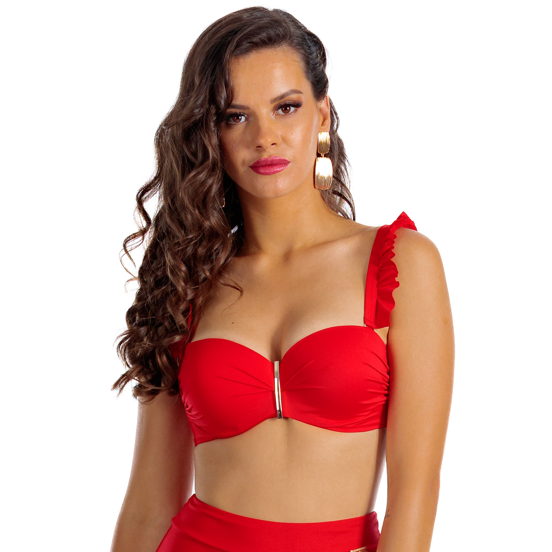 Odkryj luksusowy biustonosz kąpielowy, który łączy w sobie klasyczną elegancję z nowoczesnymi rozwiązaniami. Intensywna czerwień przywołująca na myśl zachody słońca nad lazurowym wybrzeżem, została wzbogacona złotym akcentem między miseczkami, dodającym całości królewskiego charakteru. To nie tylko strój kąpielowy – to statement modowy, który sprawi, że każde spojrzenie na plaży będzie kierować się w Twoją stronę.
