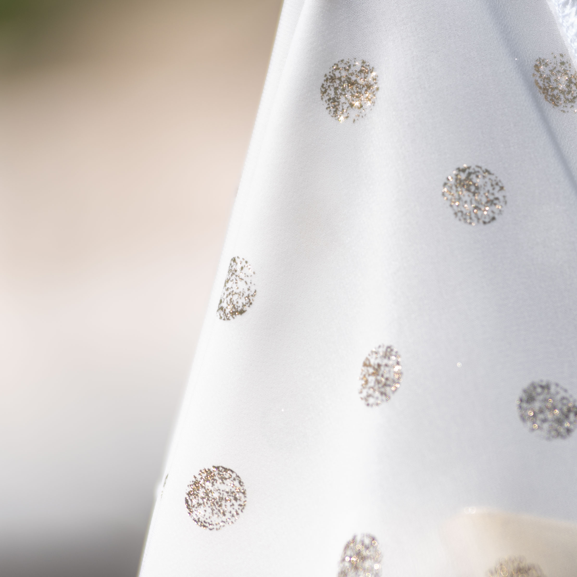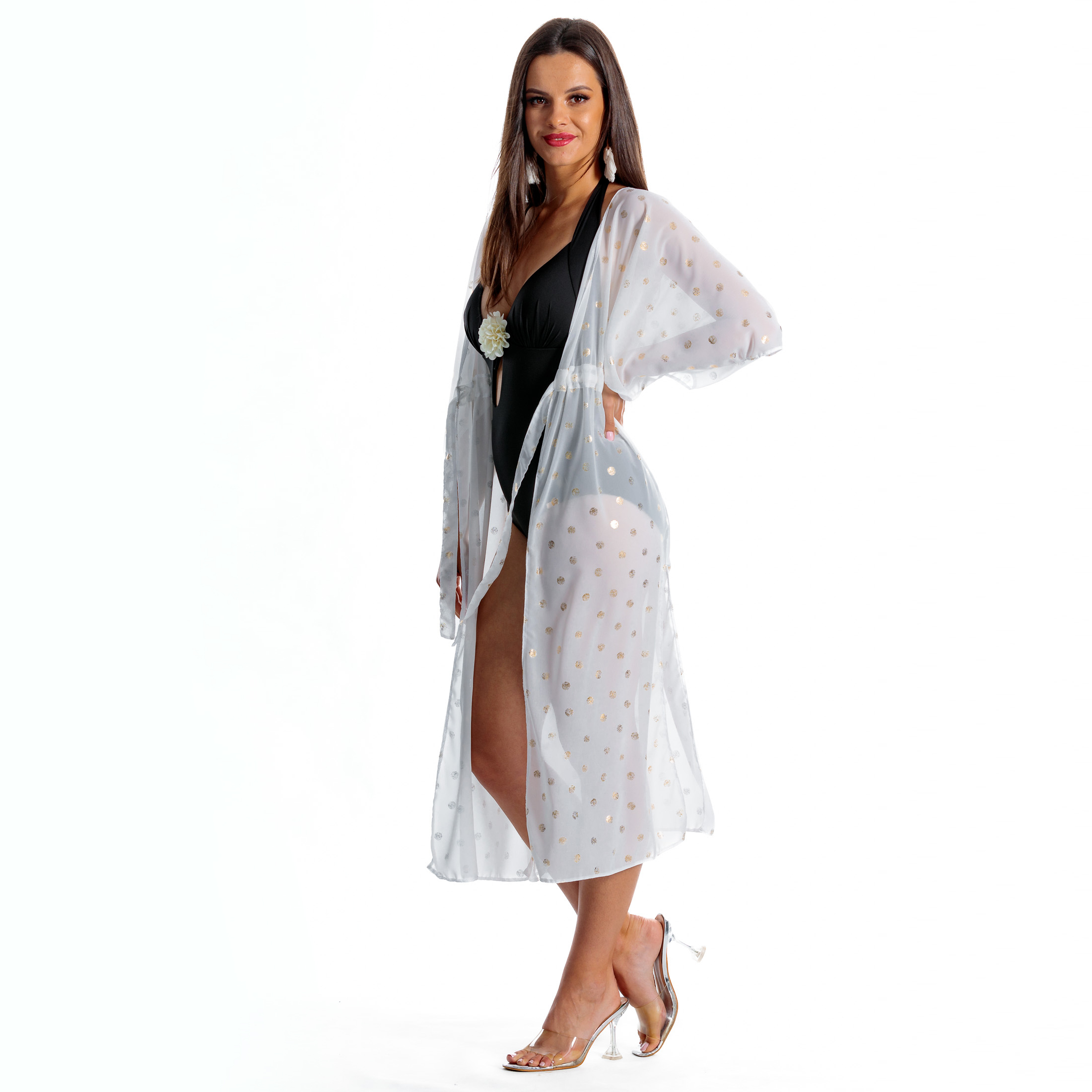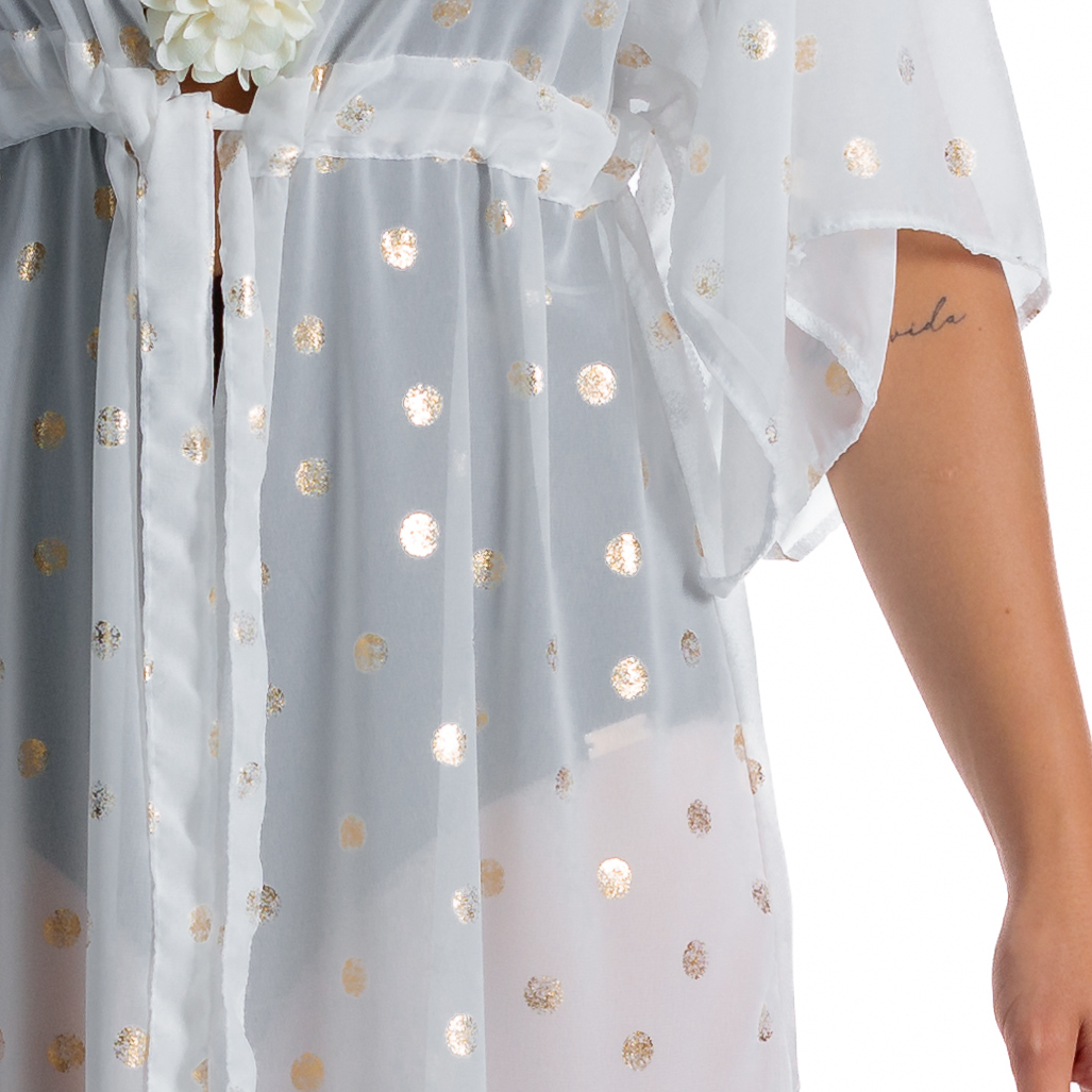 Delikatny, śmietankowy odcień bieli ozdobiony subtelnymi, złotymi kropkami tworzy magiczny efekt, który sprawia, że każda kobieta poczuje się wyjątkowo. Połyskujące detale dodają całości ekskluzywnego charakteru, idealnie komponując się z letnią opalenizną.