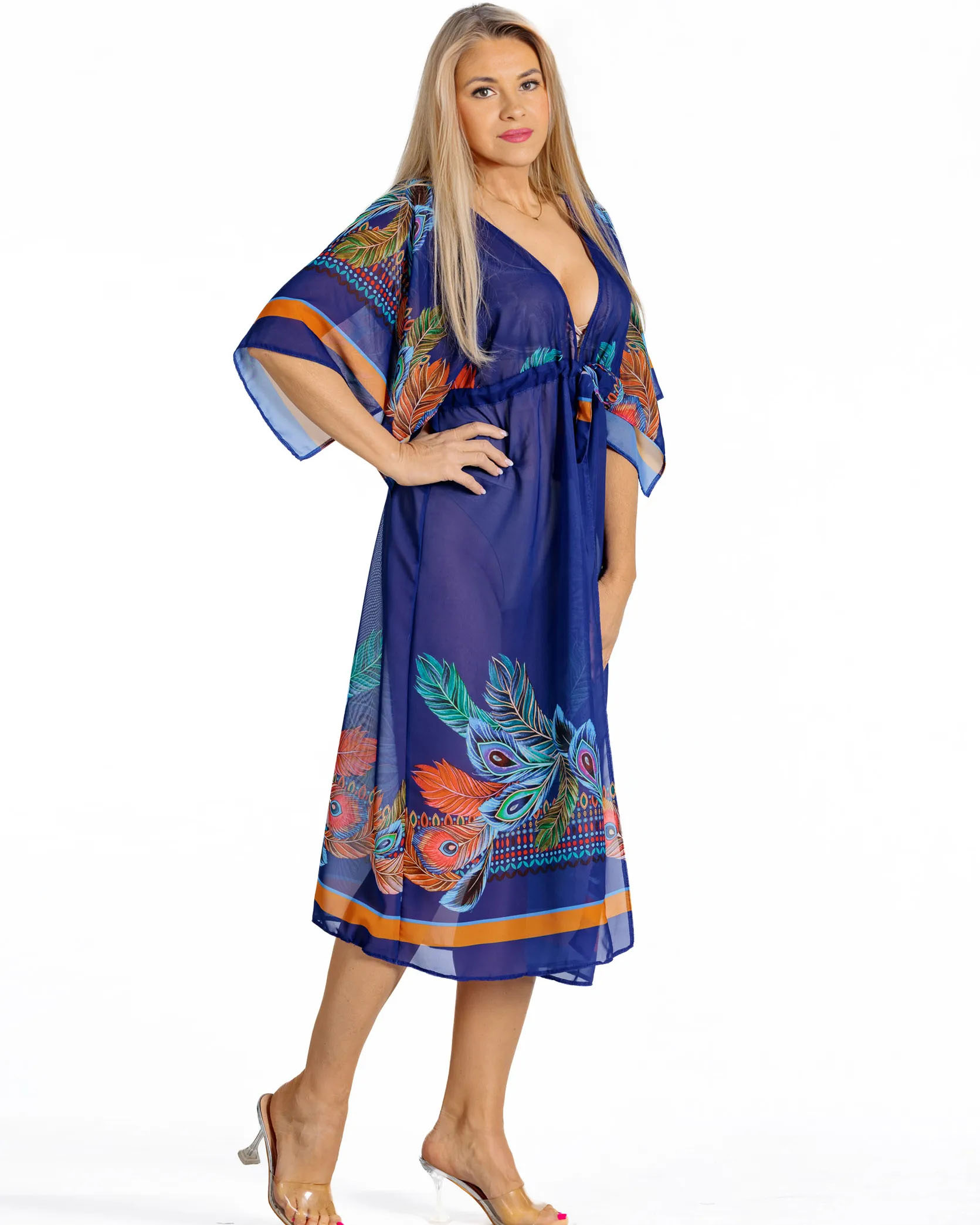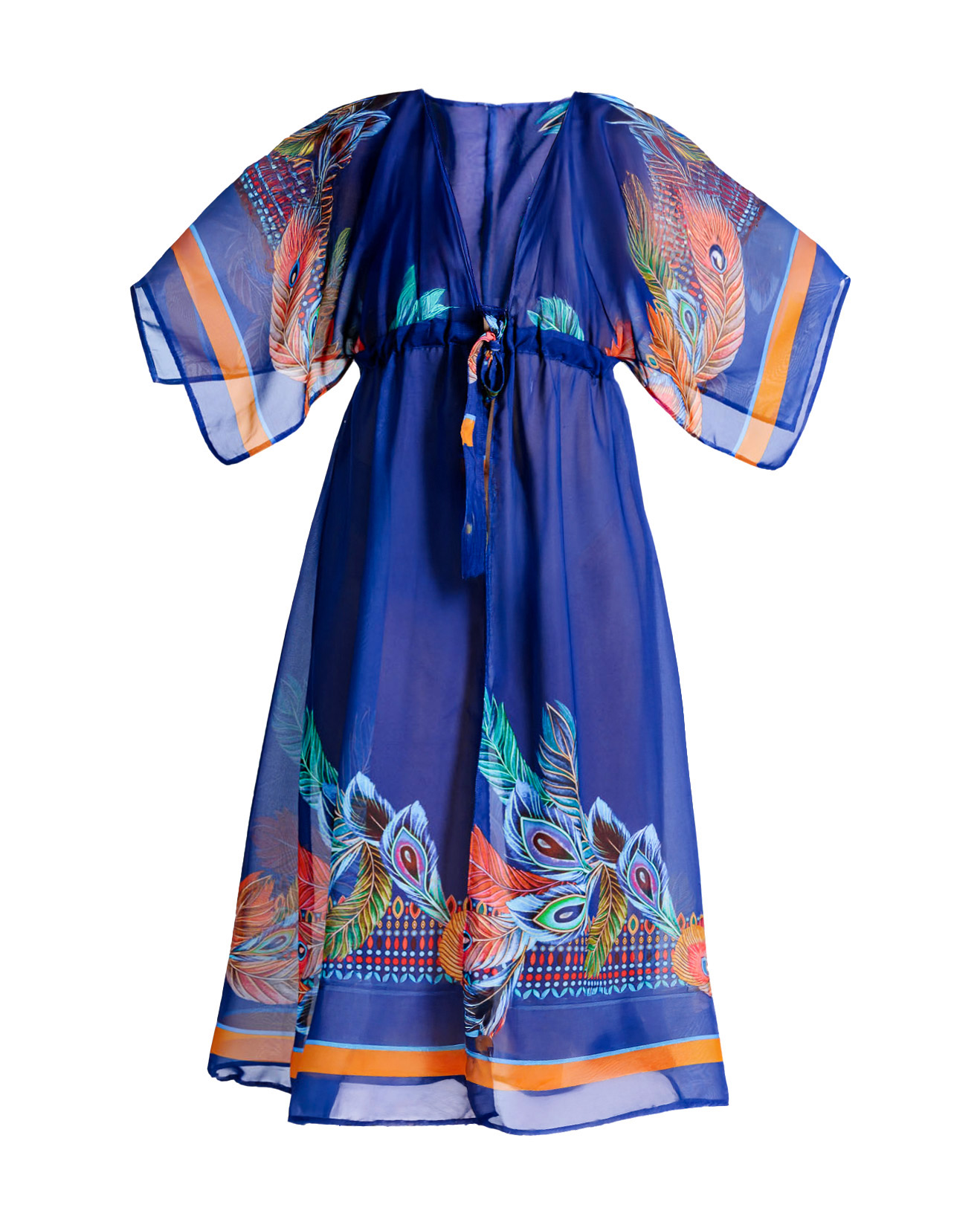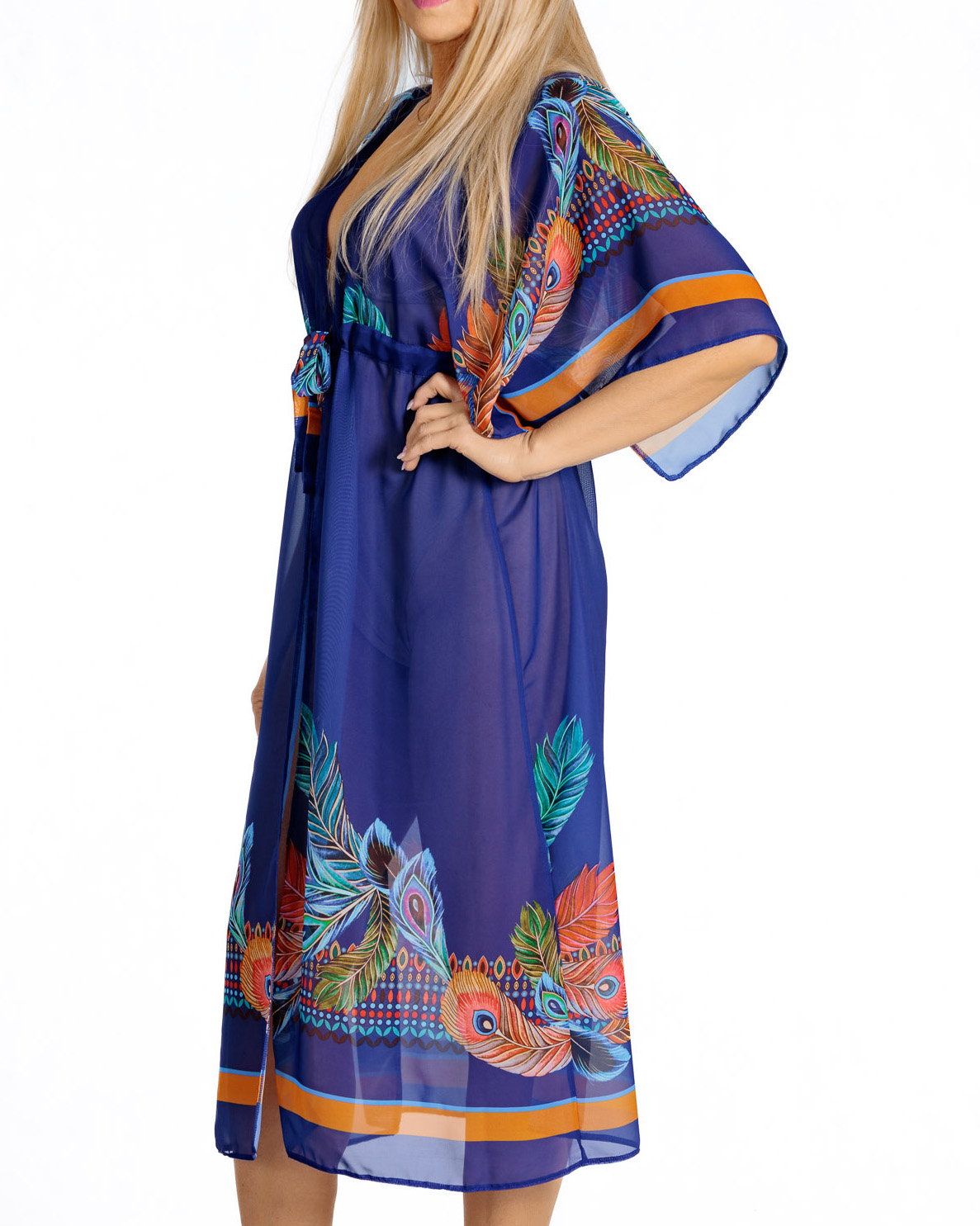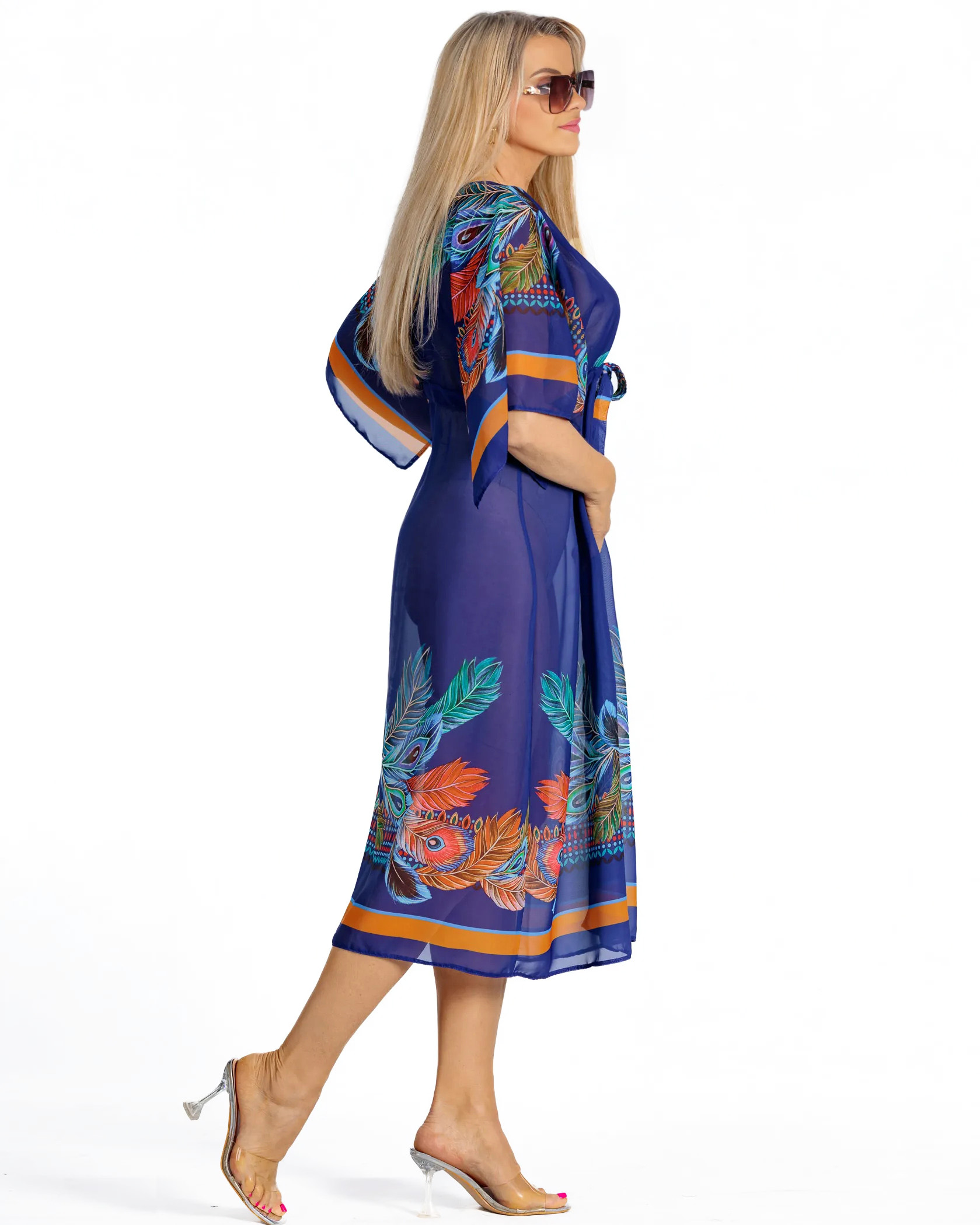 Zanurz się w oceanie elegancji z naszą granatową narzutką plażową. To nie tylko okrycie – to prawdziwe dzieło sztuki, które przemieni Twój plażowy look w stylizację godną ekskluzywnego resortu. Egzotyczny wzór pawich piór na głębokim granatowym tle przypomina tajemnicze głębiny oceanu, a pomarańczowe akcenty rozświetlają całość niczym zachodzące nad horyzontem słońce. Odcień królewskiwgo bękitu sprytnie podkreśli ciepło Twojej opalenizny.