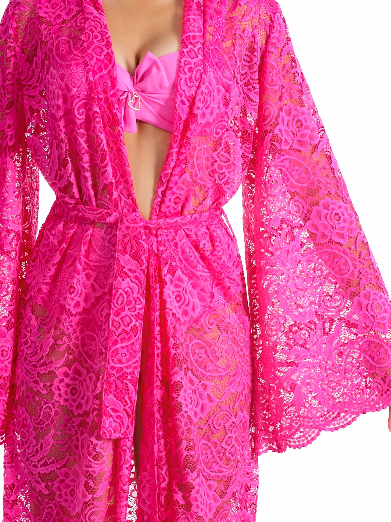 Lekki, przewiewny materiał z kunsztownym koronkowym wzorem to połączenie, które zachwyca. Szlafrok oferuje doskonałą osłonę przed słońcem, jednocześnie pozwalając skórze oddychać. Obszerne rękawy typu kimono dodają całości dramatycznego charakteru, a możliwość noszenia z paskiem lub bez sprawia, że jedna narzutka daje Ci kilka różnych stylizacji.