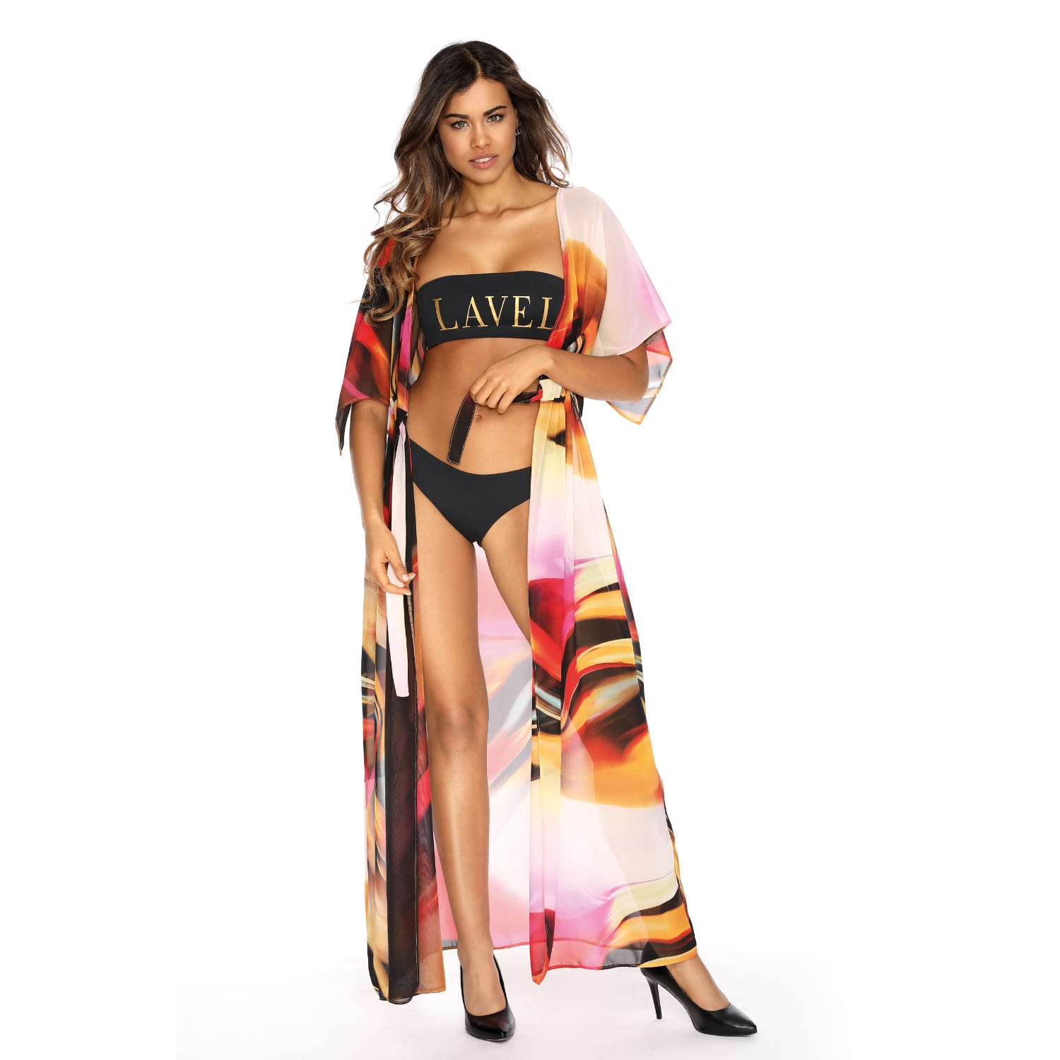 Dodatek plażowy o intensywnych barwach jasnej czerwieni, różu i pomarańczu ożywi stylizację i podkreśli opaleniznę. Sukienka zapewnia komfort i okrywa ciało przed nadmiernym nasłonecznieniem oraz podmuchami morskiego wiatru. Tego elementu garderoby można także użyć, gdy chcemy zamaskować niektóre elementy ciała. Fason zakrywający pośladki maskuje boczki i przyczynia się do wizualnego wyszczuplenia sylwetki. Luźne rękawy opadają na łokcie, dzięki czemu maskują masywniejsze ramiona. Ta sukienka będzie niewątpliwą ozdobą dla każdej kobiety podczas błogiego i beztroskiego relaksu.