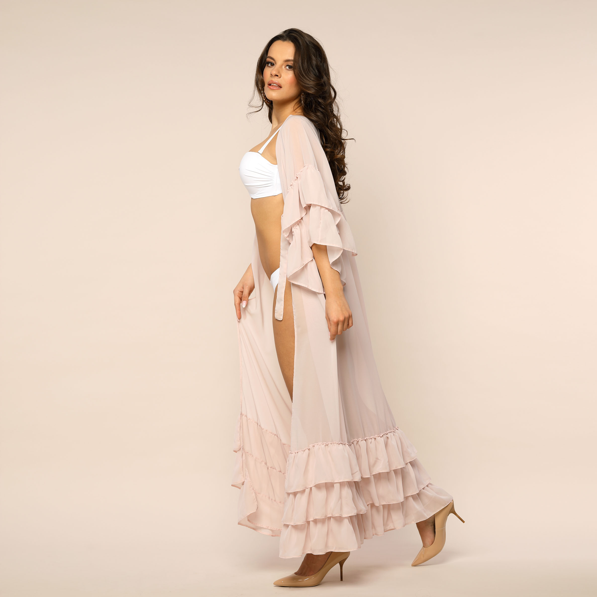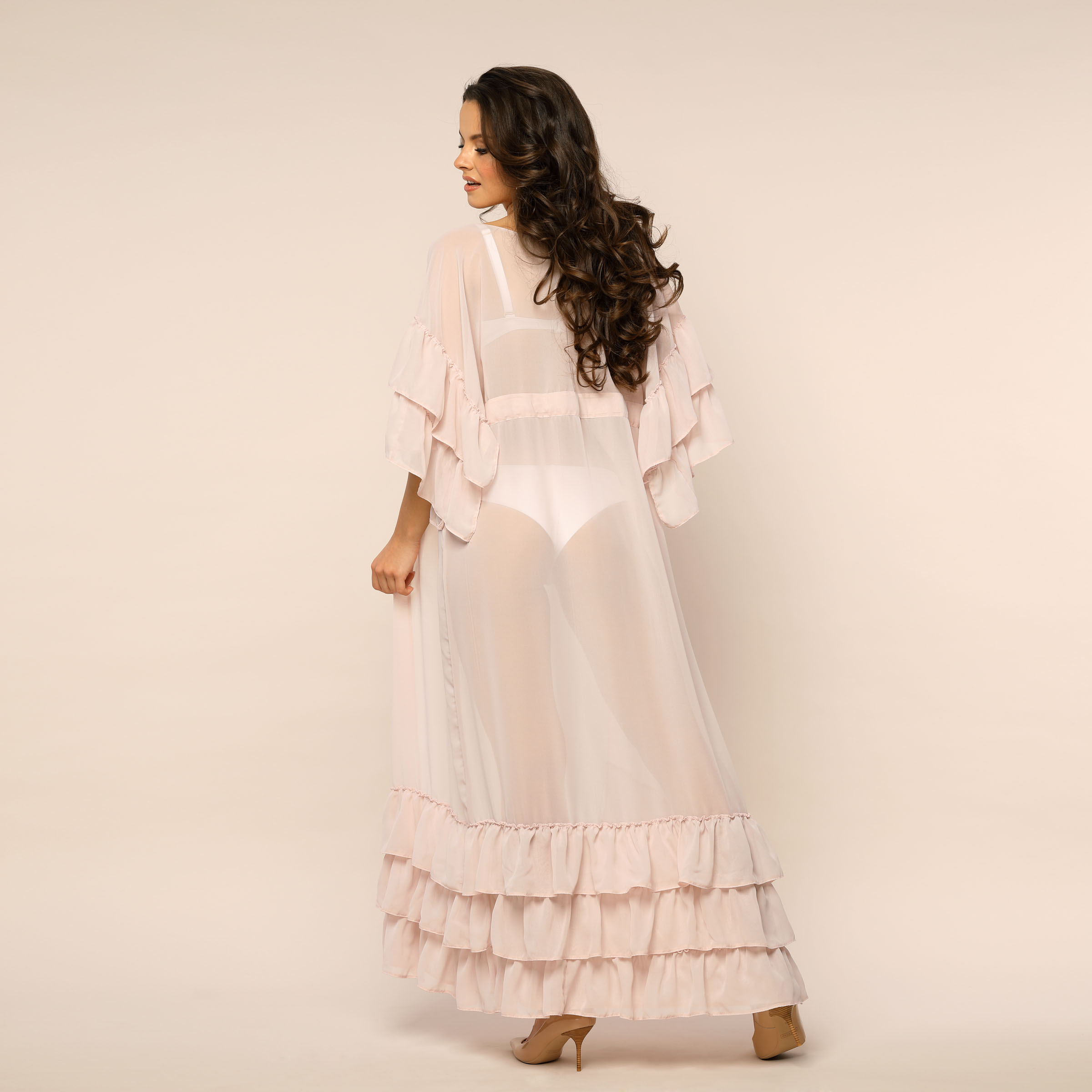 Struktura tkaniny delikatnie prześwituje, dzięki czemu każda sylwetka znakomicie się pod nią prezentuje. Krój do kostek przysłania pośladki i zapewnia atrakcyjny wygląd nóg. Rękawy za łokieć chronią ramiona oraz ręce przed nadmierną opalenizną. Pasek ściągający w talii można zawiązać na ozdobną kokardę. Podkreśla wcięcie i sprawia, że materiał miękko spływa w dół, eksponując biodra. Podwójne falbany na rękawach i potrójne na dole sukienki nadają jej wymowny, romantyczny charakter. Pudrowy kolor cudownie podkreśla złocistą opaleniznę.