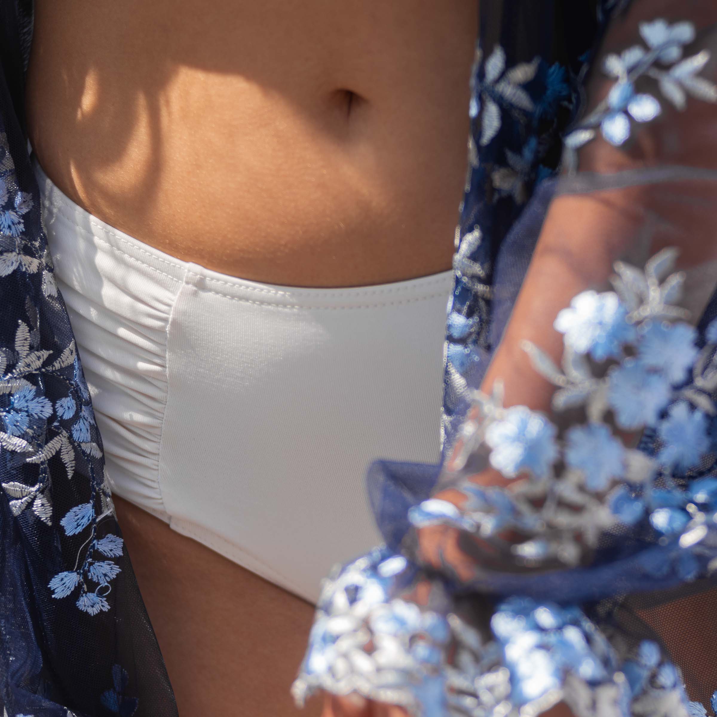 Majtki kąpielowe z podwyższonym stanem – klasyczna elegancja w śmietankowej, ciepłej bieli