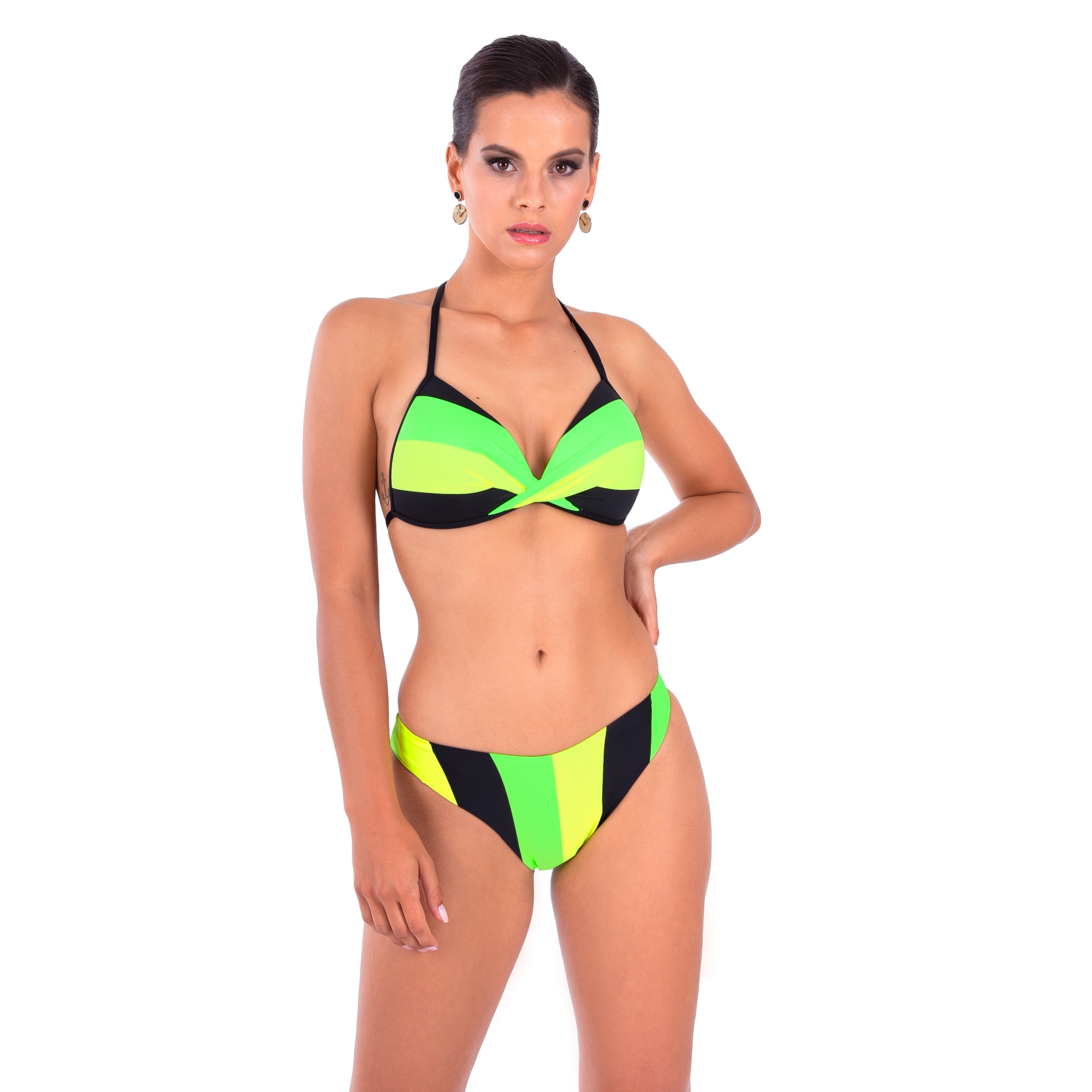 Górna część kostiumu przypomina klasyczny push-up, zapewniając perfekcyjne podtrzymanie i kształtowanie biustu. Wyjmowane wkładki push-up dają Ci możliwość indywidualnej korekty, a fiszbiny dostarczają dodatkowego wsparcia, dzięki czemu biust zyska pełniejszy i jędrniejszy wygląd. Regulowane ramiączka, które wiążemy na szyi, gwarantują idealne dopasowanie.
