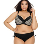 Szerokie ramiączka i czarna lamówka tworzą ramę dekoltu, której trudno się oprzeć. Objętość biustu wizualnie zwiększają rewelacyjnie wyprofilowane miseczki i gęsto rozmieszczone paseczki. Strój ukrywający boczki wyróżnia się wyższym stanem z szerokim marszczonym pasem w kolorze czarnym. Smaku dodają wiązania po bokach, które potęgują seksapil. Isabel jest propozycją dla kobiet ceniących wyrafinowany styl. Wszystkie detale kostiumu zostały zaprojektowane, aby sylwetce klepsydrze nadać oszałamiający charakter. Miękkie miseczki nie trzymają biustu tak mocno jak wersje usztywniane, ale również modelują piersi i przyczyniają się do nadania dekoltowi pociągającego wyglądu. Są przy tym wygodniejsze i przyjemniejsze w dotyku. Przy pomocy regulowanych ramiączek kostium kąpielowy można dokładnie dopasować do figury. Odległość pomiędzy ramionami a piersiami jest u każdej kobiety inna, dlatego dostosowanie długości ramiączek chroni przed ich spadaniem lub uciskaniem ciała i otarciami. Strój zapinany z tyłu ma proste w obsłudze zapięcie, które sprzyja dobremu dopasowaniu obwodu i podtrzymaniu biustu. Zapewnia stabilność w przypadku sylwetek o obfitszych kształtach.