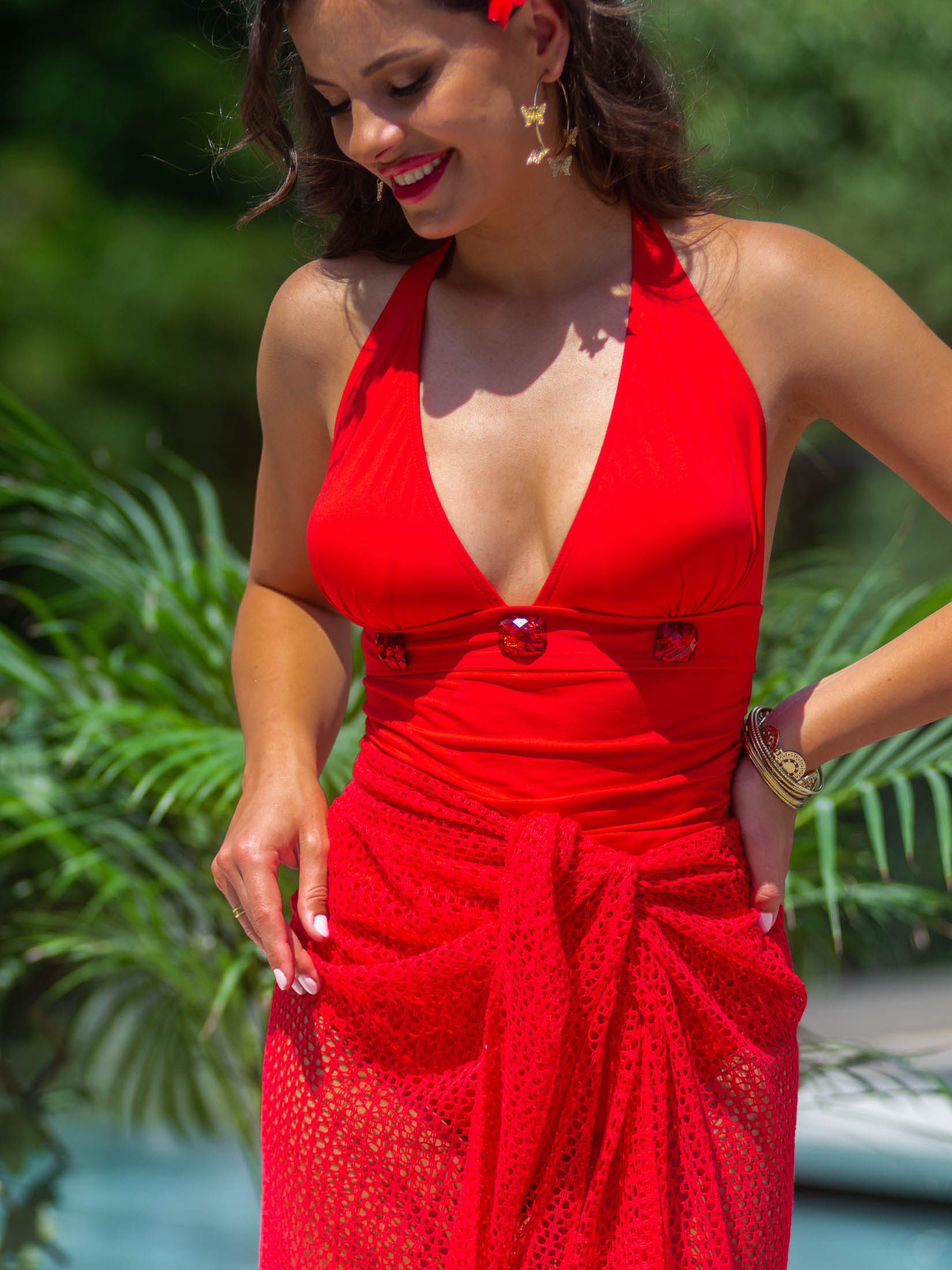 Przedstawiamy wyjątkowy kostium kąpielowy, który łączy w sobie elegancję, komfort i najwyższą jakość wykonania. Intensywna czerwień przywodzi na myśl zachodzące słońce nad błękitnym morzem, a wysublimowane detale sprawiają, że jest to propozycja godna prawdziwej gwiazdy plażowego kurortu.