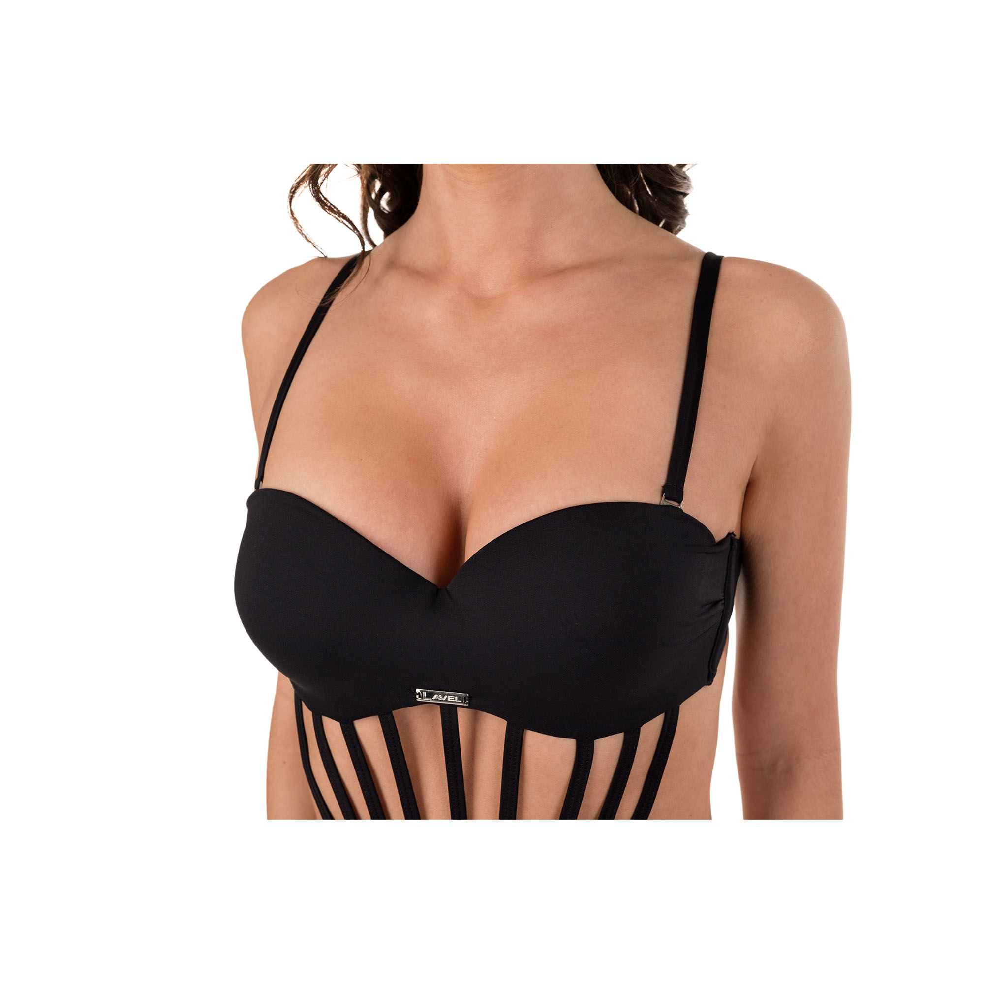 Proponujemy tobie kostium, który jest nie tylko efektowny jeśli chodzi o swoją indywidualną estetykę, ale również bardzo praktyczny. Efekt push-up delikatnie podniesie twój biust, fiszbiny, usztywniana maseczka oraz regulowane ramiączka zapewnią jego idealne położenie i zapobiegnie przemieszaniu się nawet podczas uprawiania sportów plażowych, czy wodnych. Ramiączka możesz również odpiąć, aby równomiernie opalić ramiona.