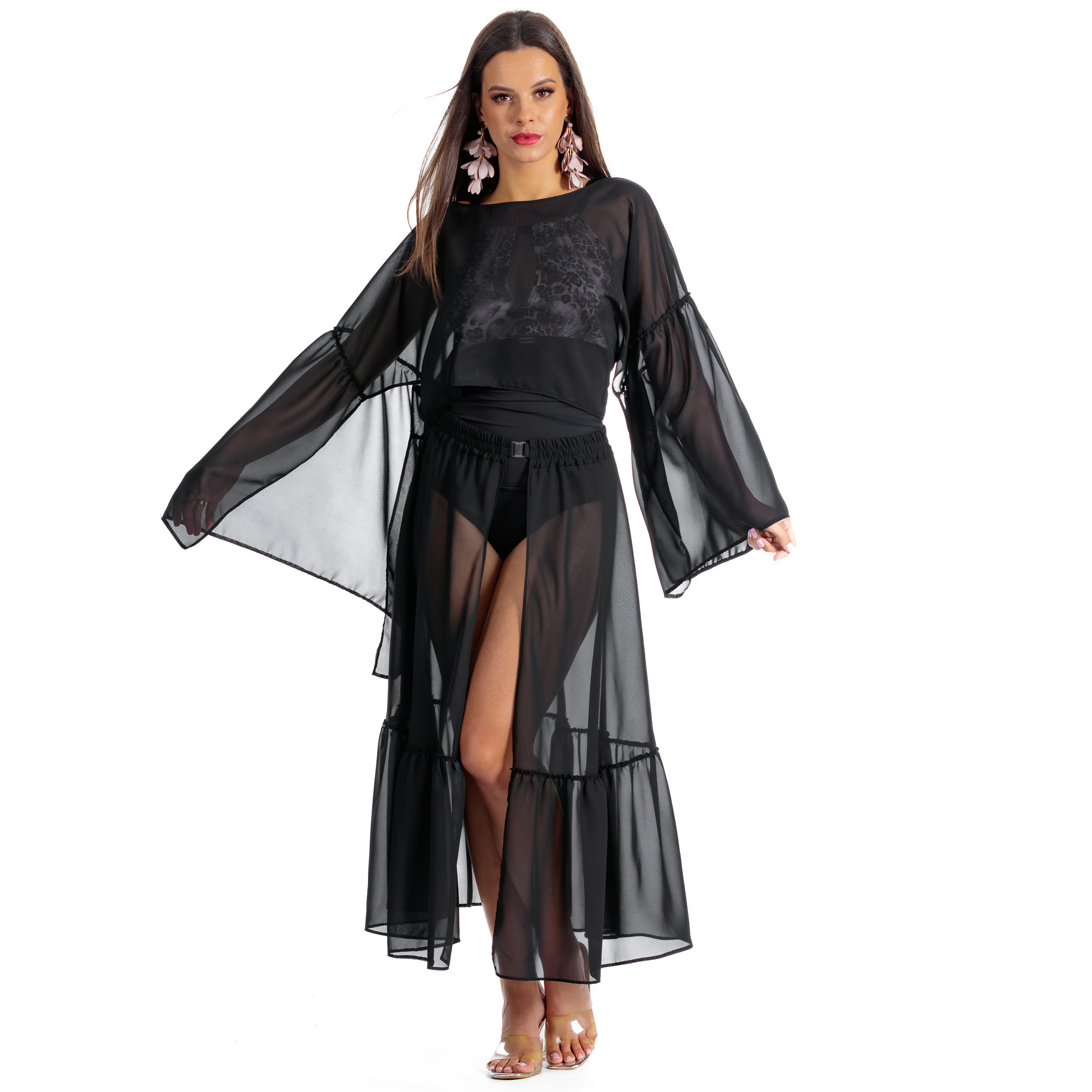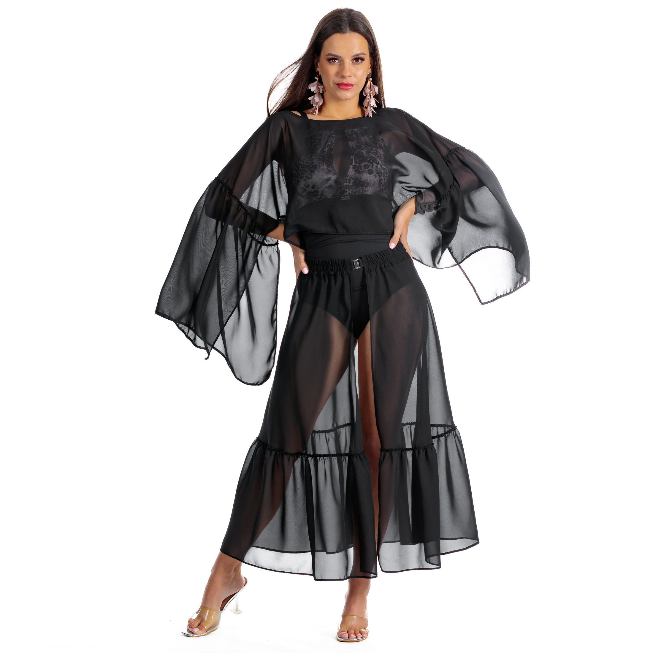 To wyjątkowa propozycja od marki LAVEL, która łączy w sobie elegancję i praktyczność. Ten czarny top plażowy z rozkloszowanymi rękawami i falbanami jest idealnym uzupełnieniem letniej garderoby dla każdej kobiety ceniącej sobie styl i wygodę.