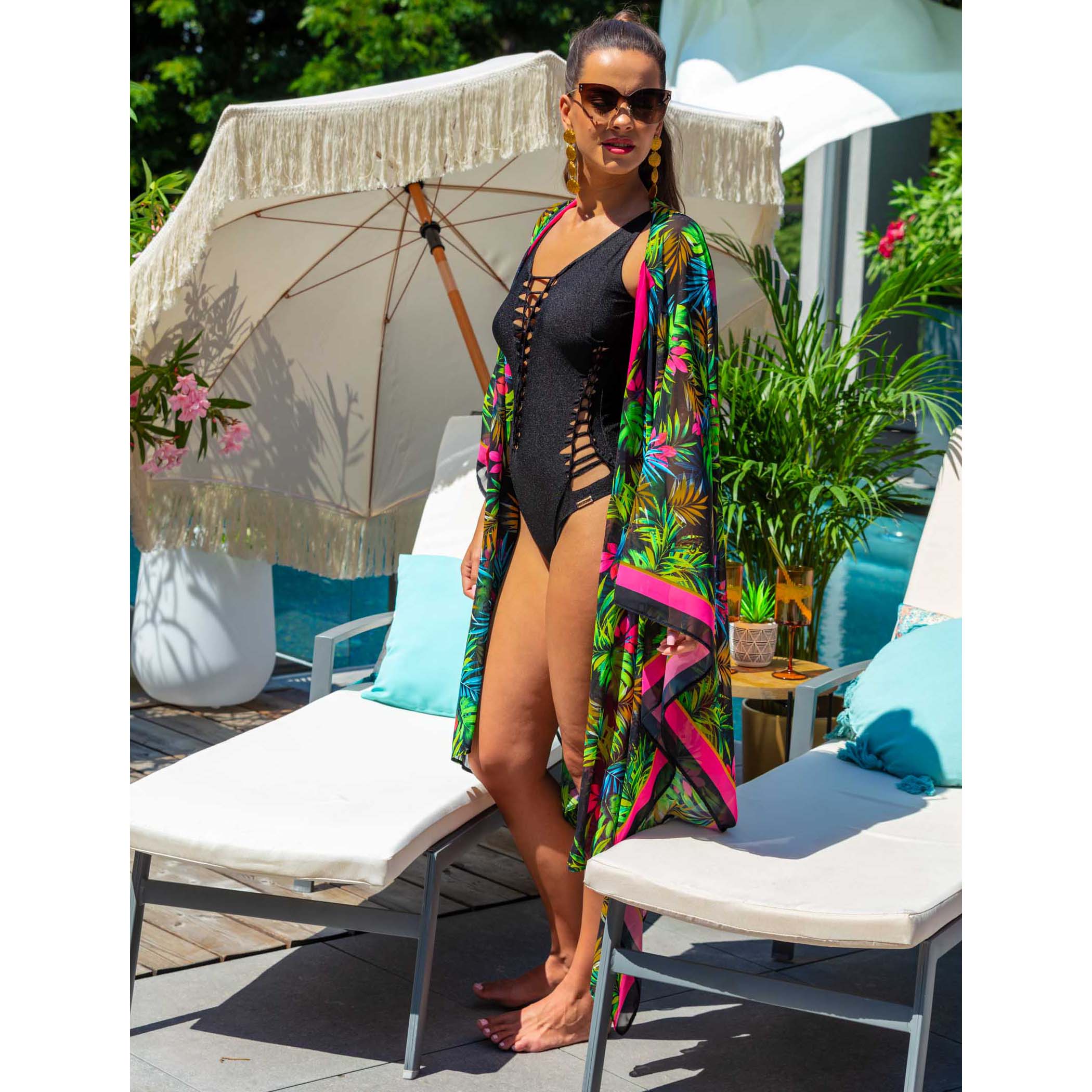 Kimono plażowe z paskiem w rośliny tropikalne od Lavel to esencja letniego, zwiewnego stylu, który doskonale komponuje się z egzotycznym klimatem. Przyciągający wzrok print w rośliny tropikalne na czarno-zielonym tle to nie tylko modny akcent, ale i sposób na wyrażenie własnej indywidualności. Wiązany pasek pięknie modeluje talię, a krój „nietoperz” z szerokimi rękawami dodaje wygodnego szyku.