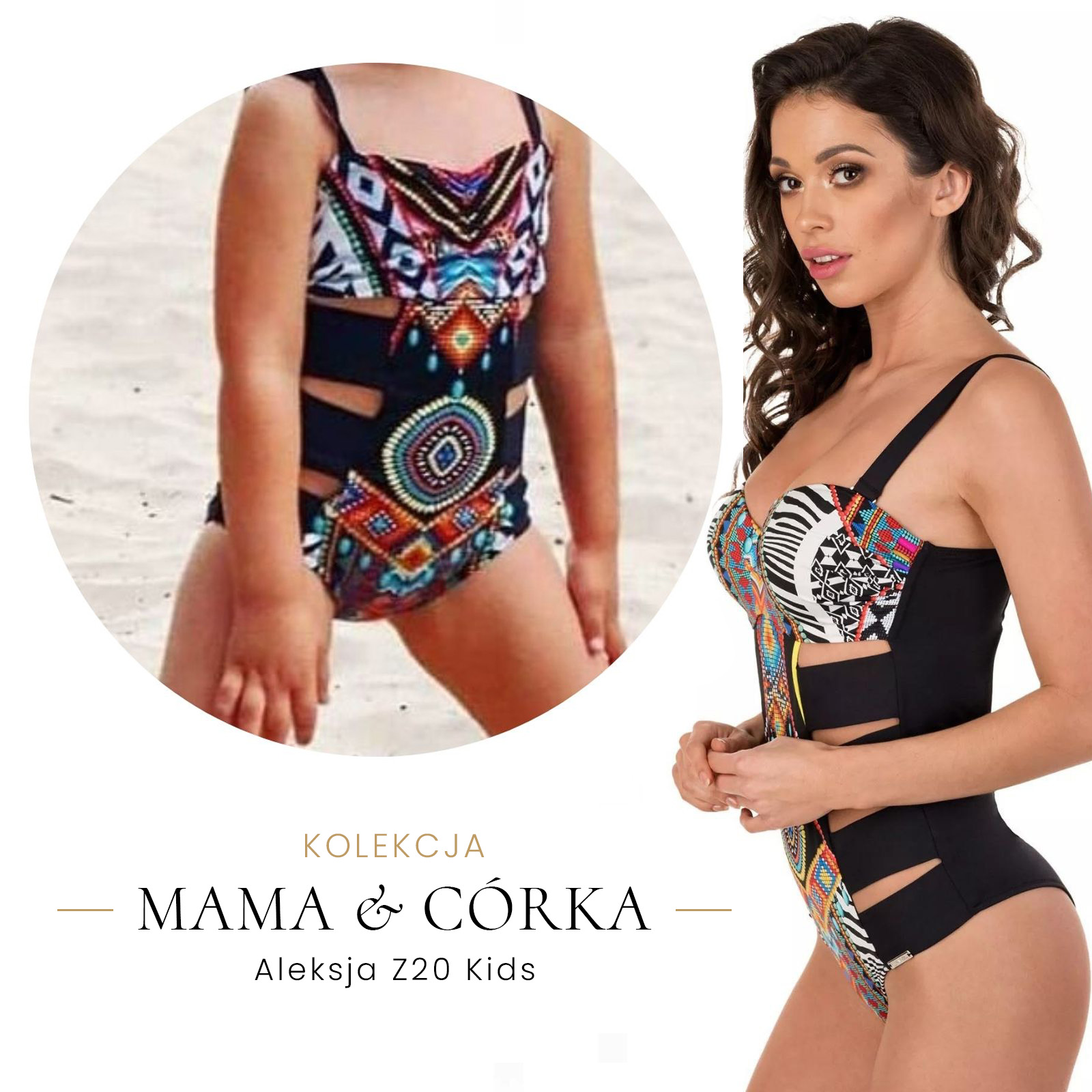Jest to jedna z naszych 4 propozycji do kompletów strojów kąpielowych w wersji dla mam i córek. Kostium jest uszyty z czarnego materiału z ozdobnym printem, imitującym wypukłe zdobienia. Tak samo jak w wersji dorosłej – po bokach widnieją poziome wycięcia. Strój jest niezwykle wygodny, dokładnie przylega do ciała i nie przeszkadza małym elegantkom podczas szalonych zabaw na plaży czy basenie.