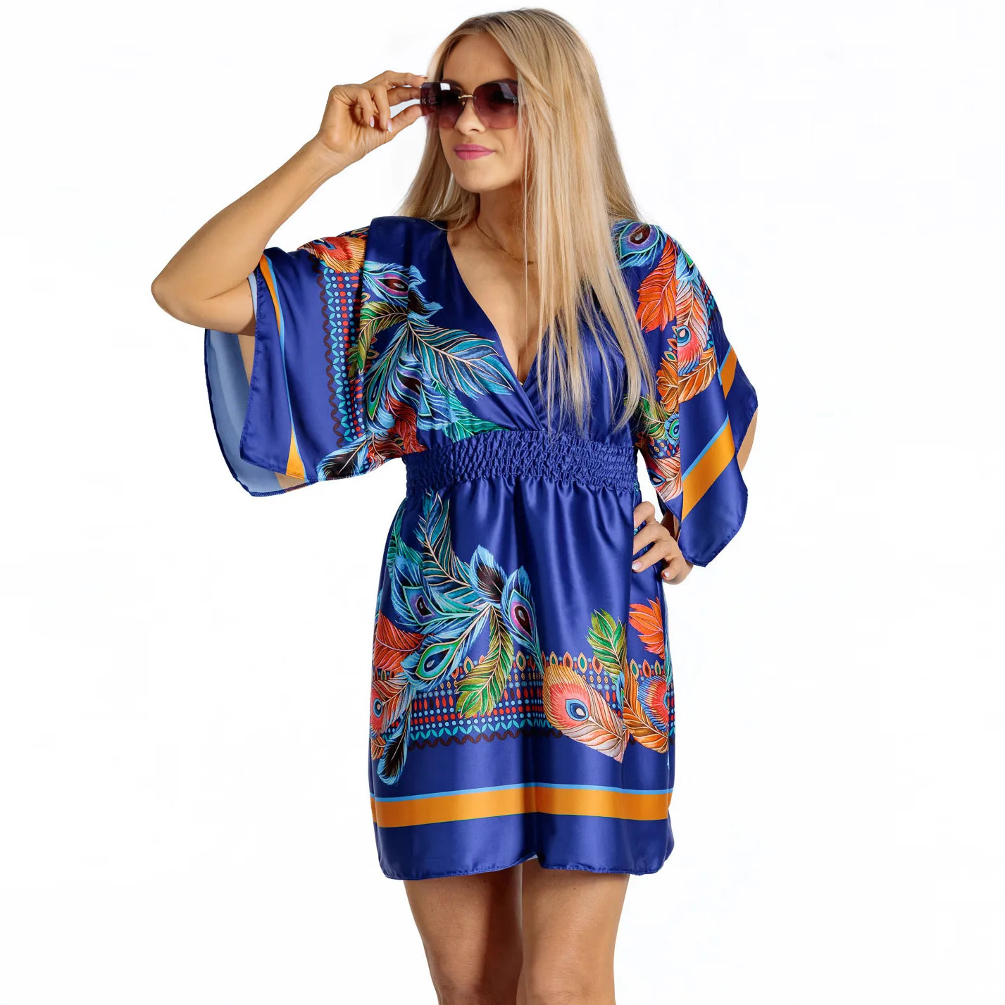 Zanurz się w głębię królewskiego granatu, ozdobionego zjawiskowym wzorem pawich piór. Ta wyjątkowa sukienka plażowa to prawdziwa perełka wśród plażowych dodatków, która przeniesie Cię w świat ekskluzywnych kurortów i luksusowych jachtów.