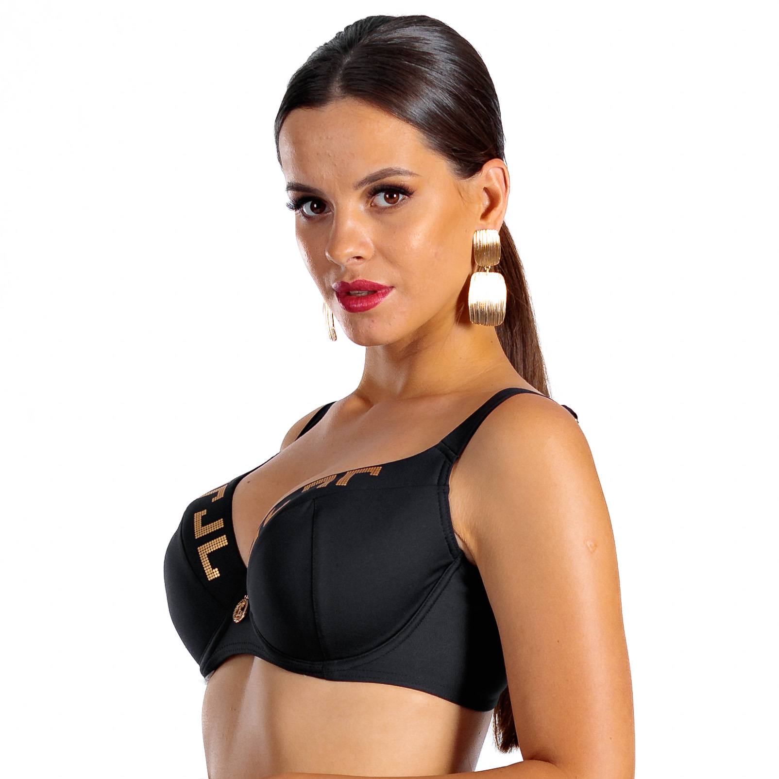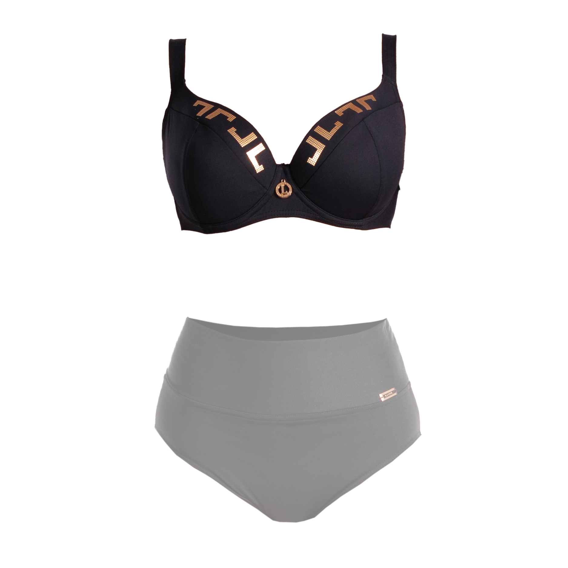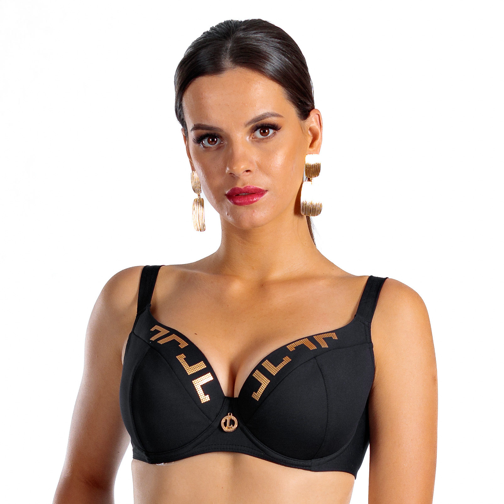 Czarny kolor biustonosza Loren L Cup Negro jest tak głęboki i intensywny, jak każdy kolor czarny (Negro) w paletach Lavel, to dokładnie ten sam odcień. Idealnie komponuje się również z kolekcją Gold co sprawia, że możesz z łatwością dobrać dół od bikini odpowiadający Twoim potrzebom i w dogodnym rozmiarze. Złote emblematy dodają luksusowego akcentu, podkreślając elegancki charakter stroju kąpielowego.