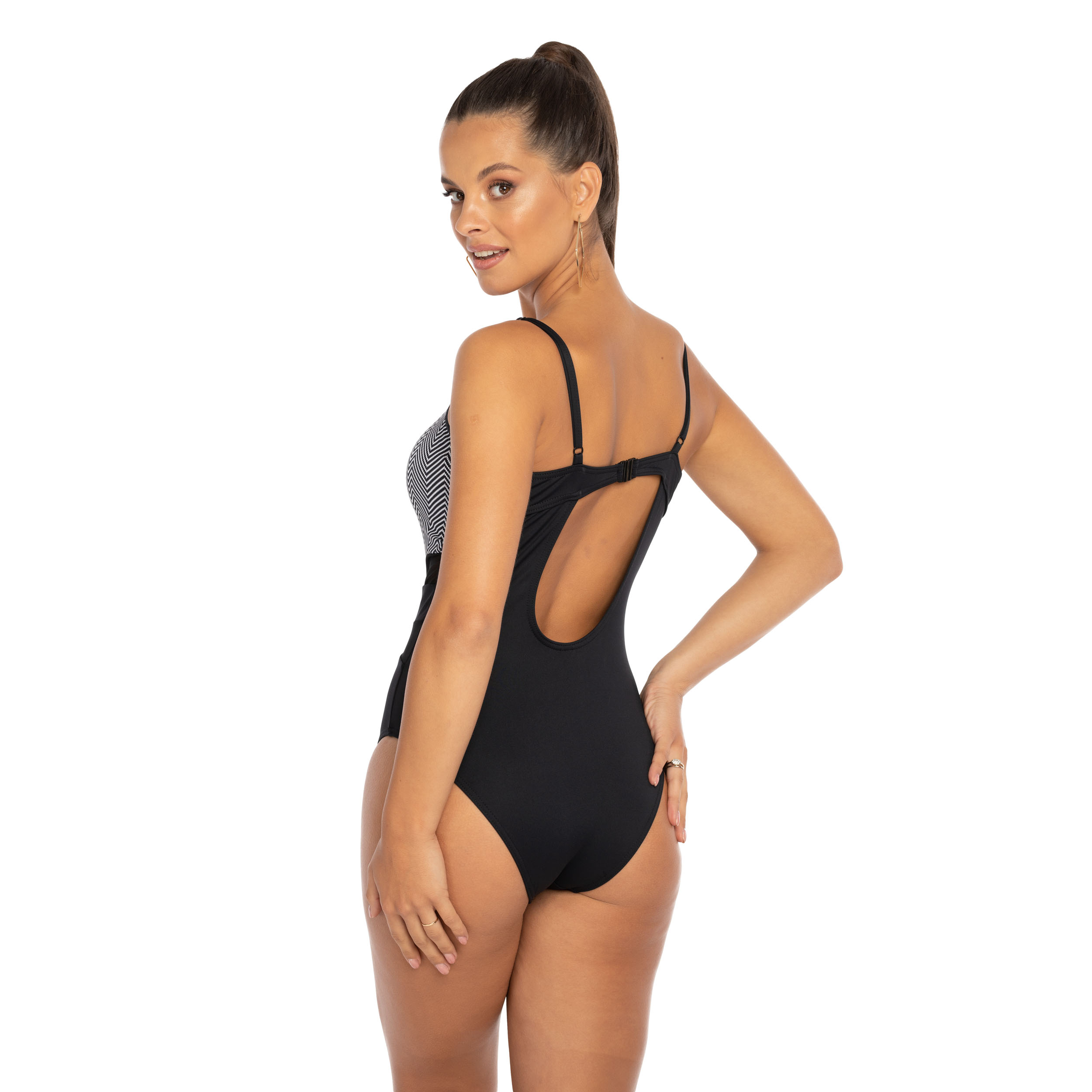 Jednoczęściowy czarny strój kąpielowy z motywem jodełki