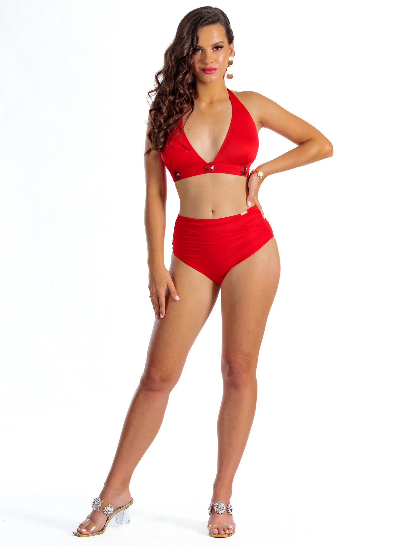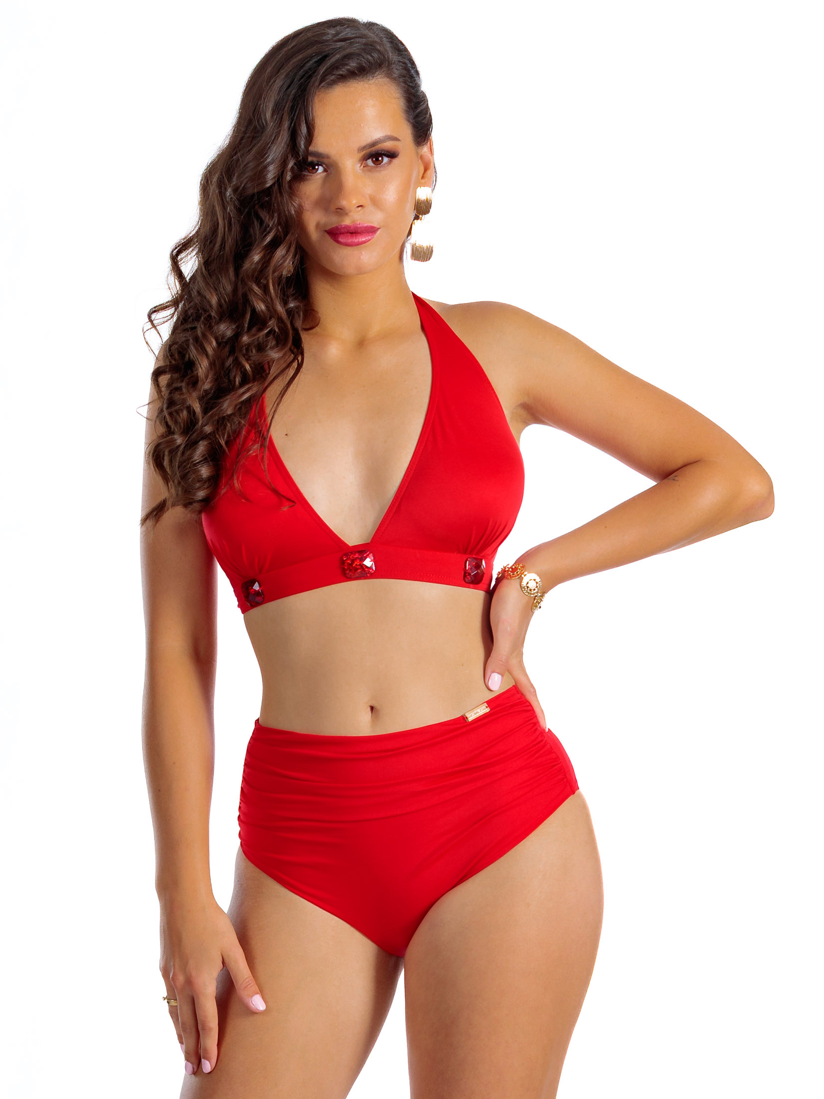 Czerwona góra bikini wiązana na szyi – luksusowy biustonosz z kryształkami