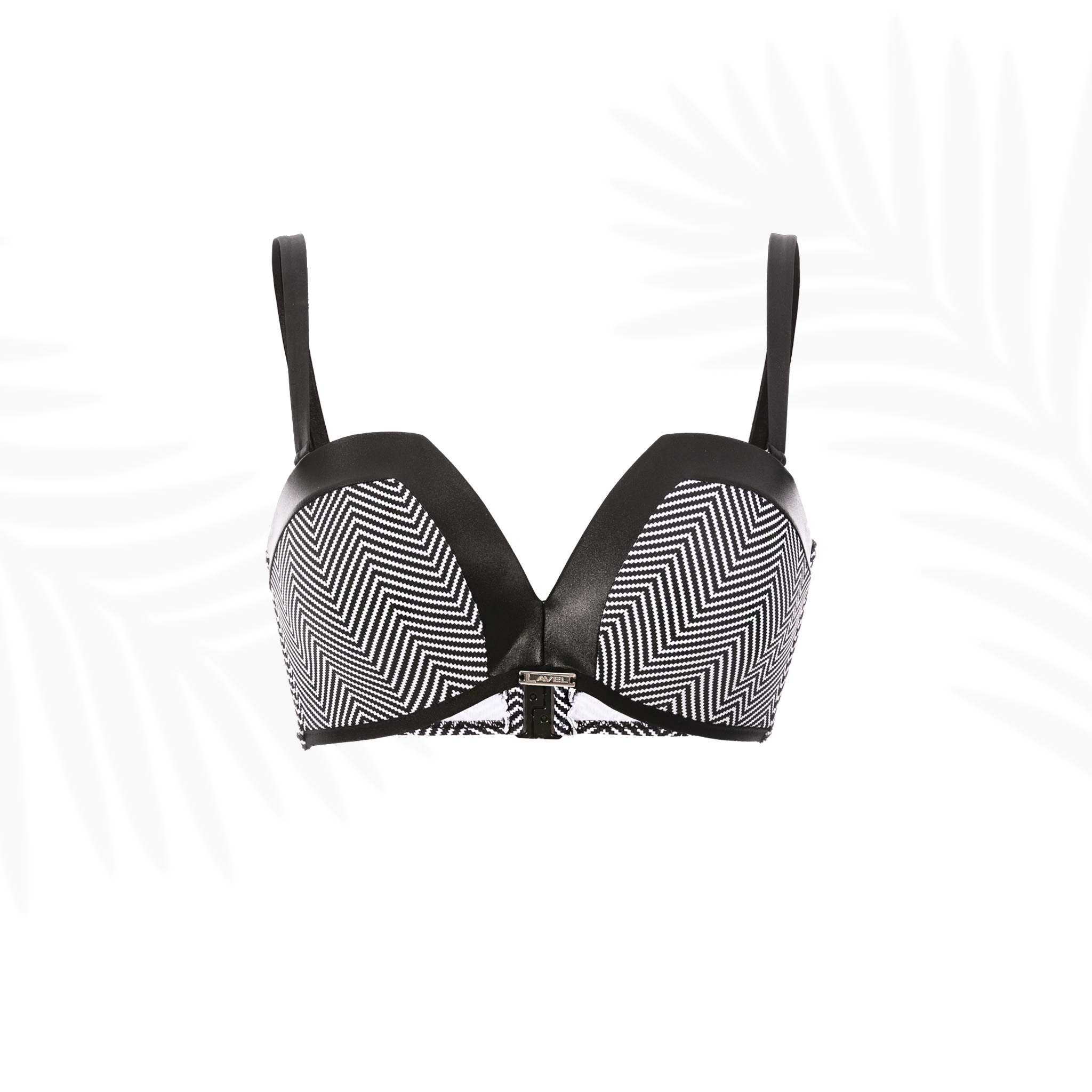 Wkładki push-up nadają małym piersiom krągłe kształty. Można je wyjąć. Umożliwia to wymodelowanie większych biustów zgodnie z indywidualnymi potrzebami. Fiszbiny zapewniają lepsze podtrzymanie piersi. Dla ochrony wrażliwych stref ciała umieszczono je w miękkich kieszonkach. Ramiączka są regulowane i zapinane na dwa sposoby: klasycznie oraz na krzyż. Można je odpiąć, aby uzyskać piękną opaleniznę górnej części ciała. Zapięcie z tyłu na zatrzask pozwala czuć się pewnie podczas każdej aktywności. Kuszące wycięcie w kształcie litery V powoduje, że wzrok podąża ku biustowi.