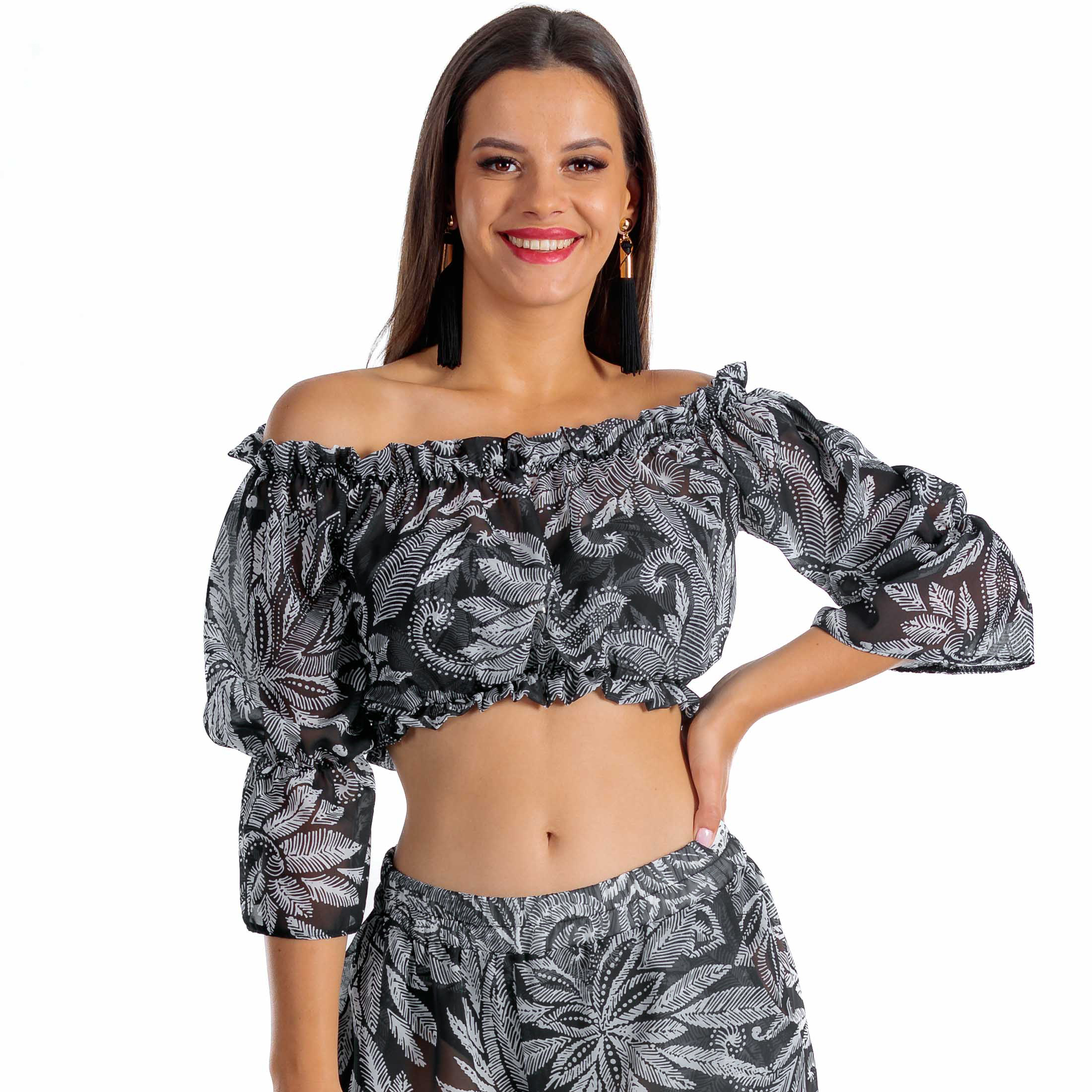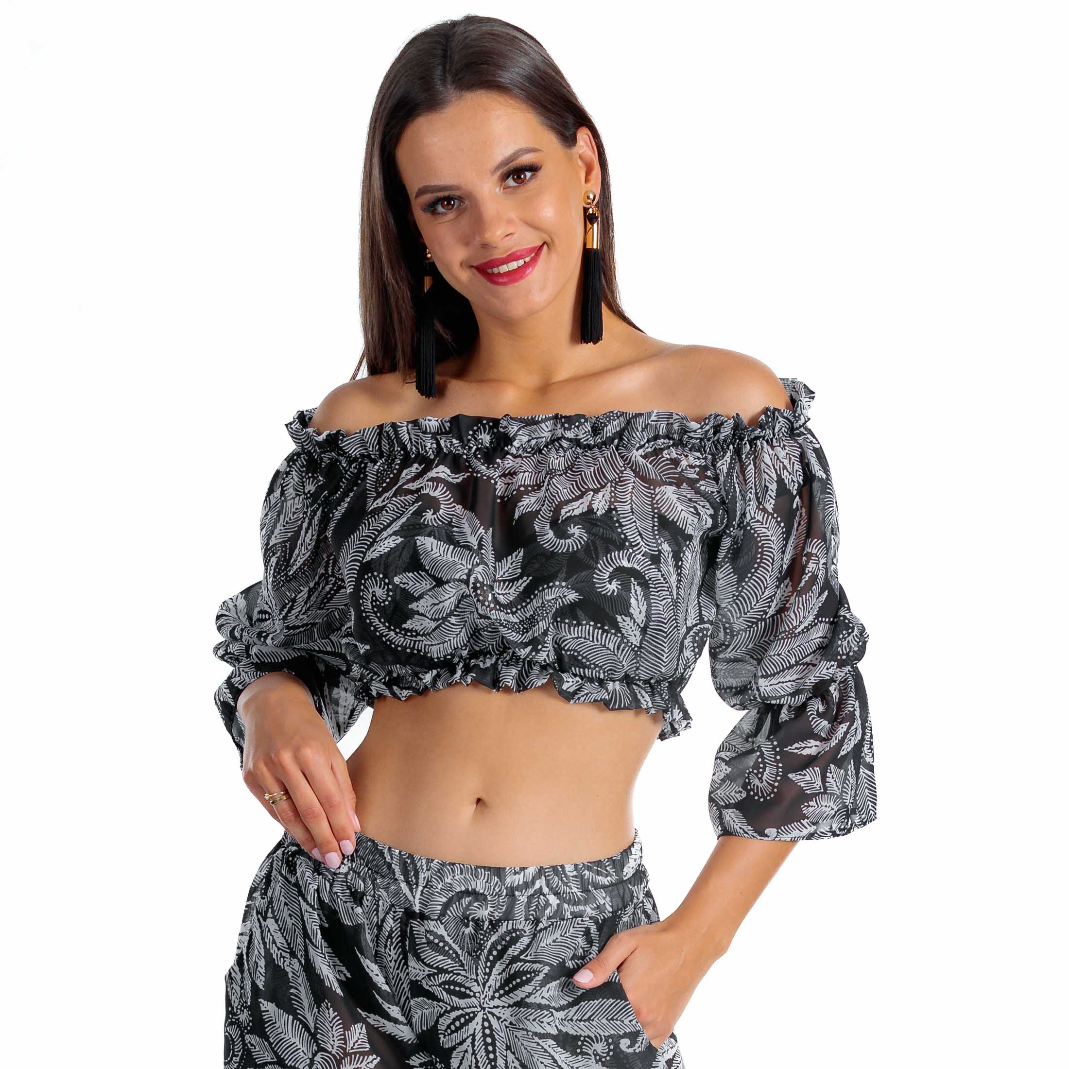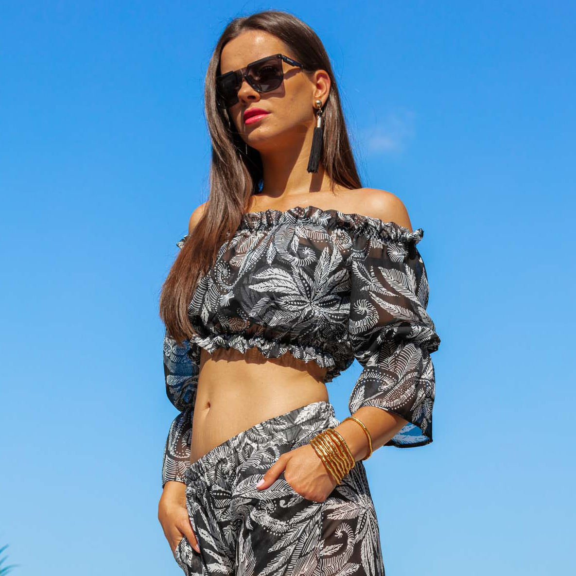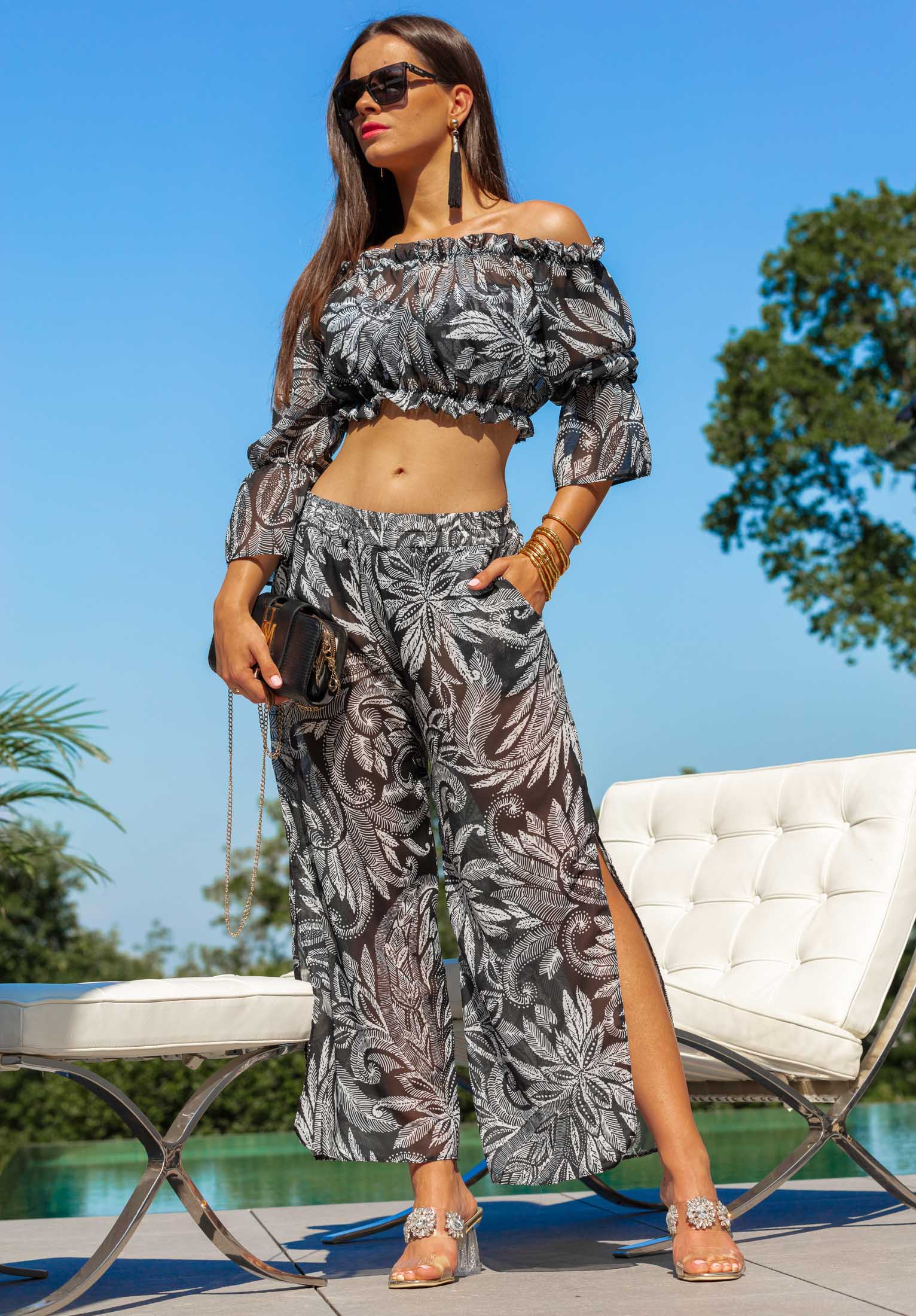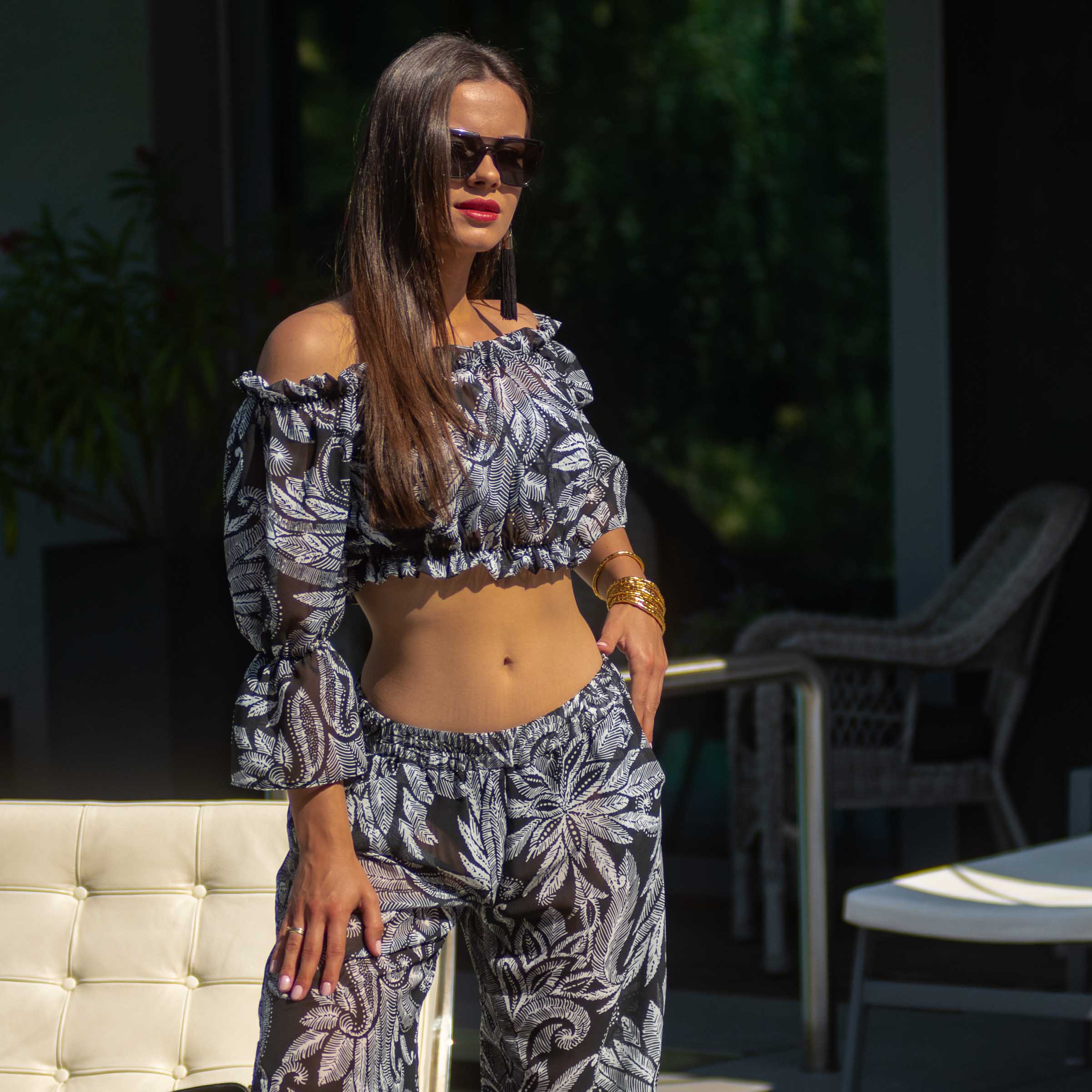 Zachwycający wzór w liście paproci w czarno-białej kolorystyce sprawia, że top jest nie tylko osłoną przed słońcem, ale prawdziwą ozdobą każdej plażowej stylizacji. Półprzezroczysta tkanina dodaje lekkości i zmysłowości, jednocześnie zapewniając dyskretną osłonę.